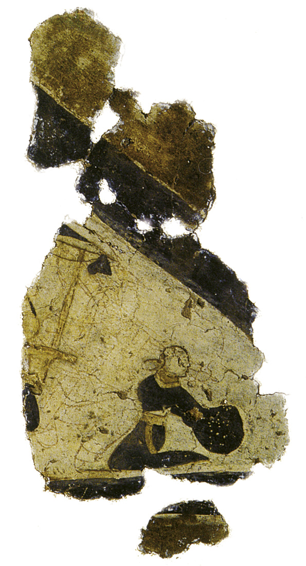 • 人物绘于黑色宽带的三角形右侧,头戴风帽,身着白领缁衣,腰束白带,侧身跪地,双臂前伸。此人物身后遗存侧身蹬地、挽弓射箭的赭红色线描人物画稿