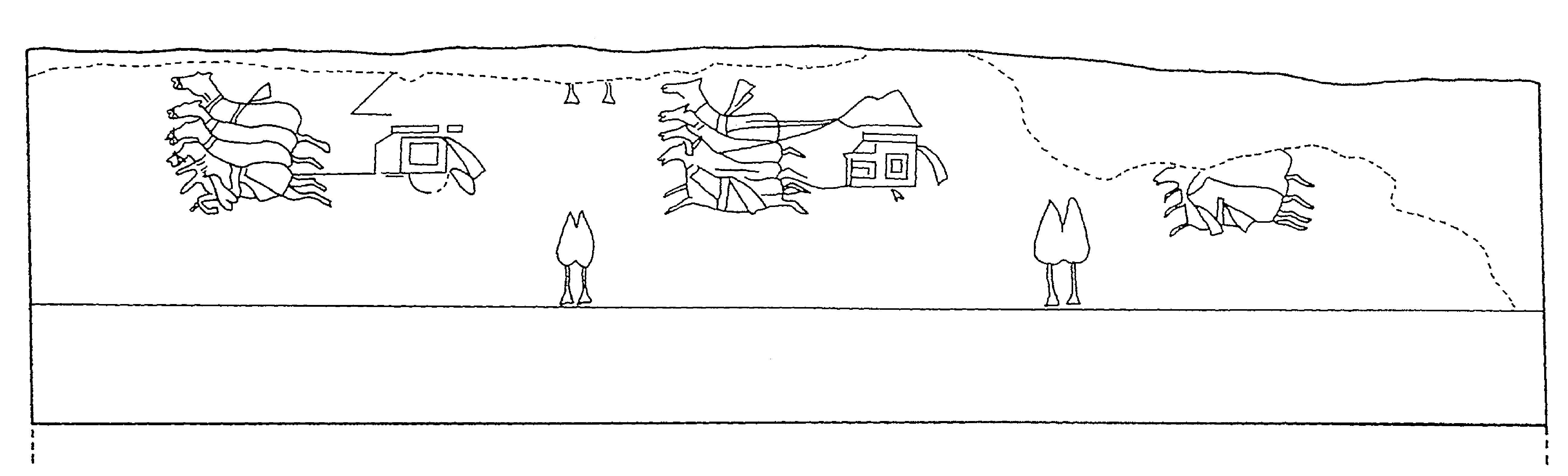 • 秦都第3号宫殿遗址绘有壁画的廊道长32.4米、宽5米,共计九间。东西两壁均绘壁画。墙体利用夯基切削而成,经粗、细草泥加工抹光,然后墙面涂白灰粉刷,处理光平后绘壁画。东壁第一、二、三、八间壁画已不存