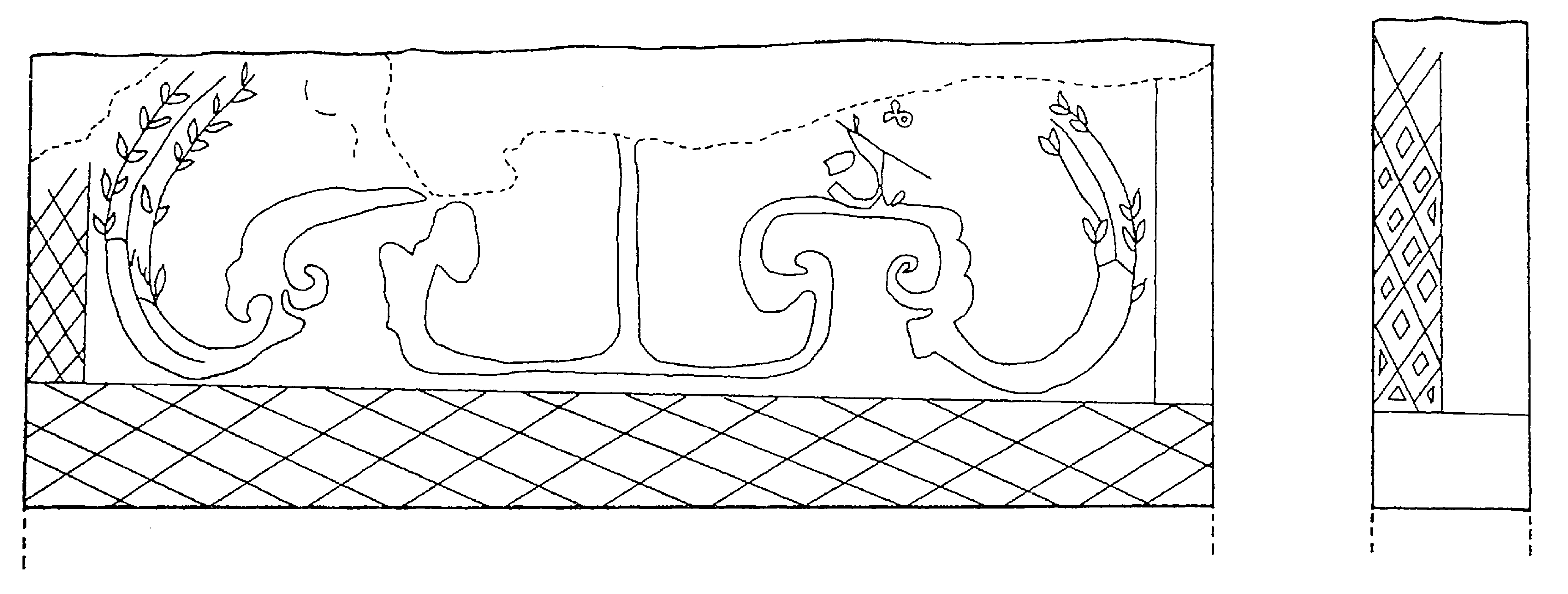• 秦都第3号宫殿遗址绘有壁画的廊道长32.4米、宽5米,共计九间。东西两壁均绘壁画。墙体利用夯基切削而成,经粗、细草泥加工抹光,然后墙面涂白灰粉刷,处理光平后绘壁画。东壁第一、二、三、八间壁画已不存
