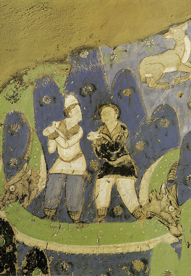 • 图中两人为商人打扮,双手合十。有一双头龙身体缠绕于西侧山峰。此为马壁龙王本生故事,表现商人遇险后被马壁龙王所救而向龙王敬礼感谢之场面