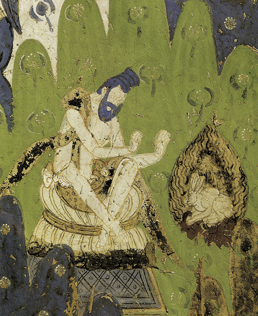 • 图中左侧为一婆罗门,坐于束腰帛座上,右侧为一在火中的兔子。此图表现兔王自焚以供养梵志的本生故事