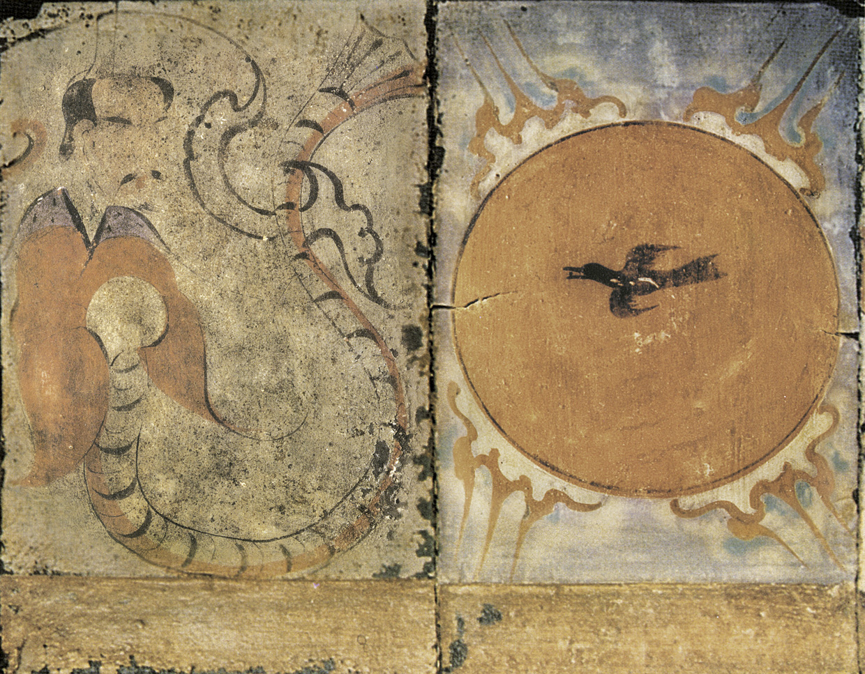 • 图中伏羲人首蛇身,拱手而立,其侧太阳中飞金乌