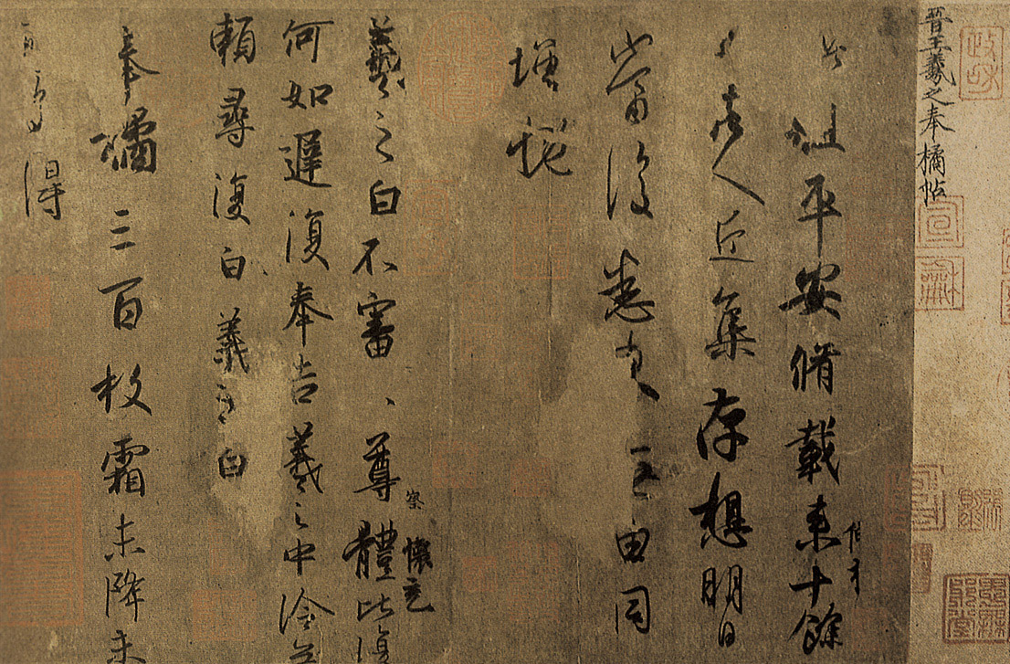 • 《平安何如奉橘三帖》,行书,三帖同书于一纸之上,前四行是为平安帖,次三行为何如帖,最末二行为奉橘帖,帖文大概是慰问酬对之语。此帖前隔水上有瘦金书题签「晋王羲之奉橘帖」,下钤宣和朱文连珠玺。羲之书法,载誉千年,惟世传墨迹,多为唐人临本,或钩摹本,此帖流传有绪,历代藏家多定为羲之真迹。用笔圆钝,结体平稳匀称,在优美的姿态中,流露出质朴内敛的意韵。