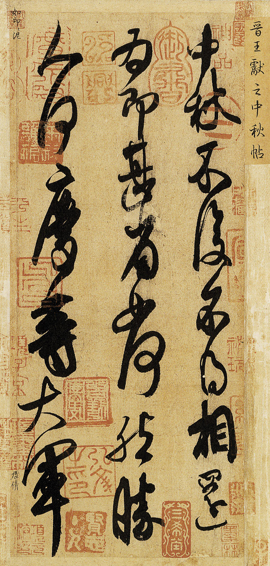 《地黄汤帖》,又名《新妇帖》,东晋王献之的草书作品。现存墨迹本是唐人摹本,晚清时期流入日本。此帖在《淳化阁帖》、《大观帖》、《三希堂法帖》、《筠清馆法帖》等历代著名丛帖中多有摹刻,受到广大学书者的重视。用笔外拓,笔画圆腴而纵逸。整幅字富有节奏感,开头“新妇”两个字是行书刚落笔速度较慢,写得凝重端稳,“服”字以后,渐渐放开,到第二行用笔已经很洒脱,笔画连绵宛曲,提按自然,轻重变化,充满韵律感,墨色浓淡、枯润相间,使得全帖个有散朗舒展的特点。原珍藏于宋内府,高宗赵构题签。为《淳化阁帖》卷第十所收。经贾似道,明代文徵明、王宠、文彭,清代孙承泽、吴荣光、罗振玉递藏后,于明治四十四年(1911)十二月三日,通过文求堂归中村不折(1866—1943)所有。卷末有文彭、常生、成亲王、英和等六家观记题跋。吴荣光获此帖时,模刻于所辑集帖《筠清馆帖》。