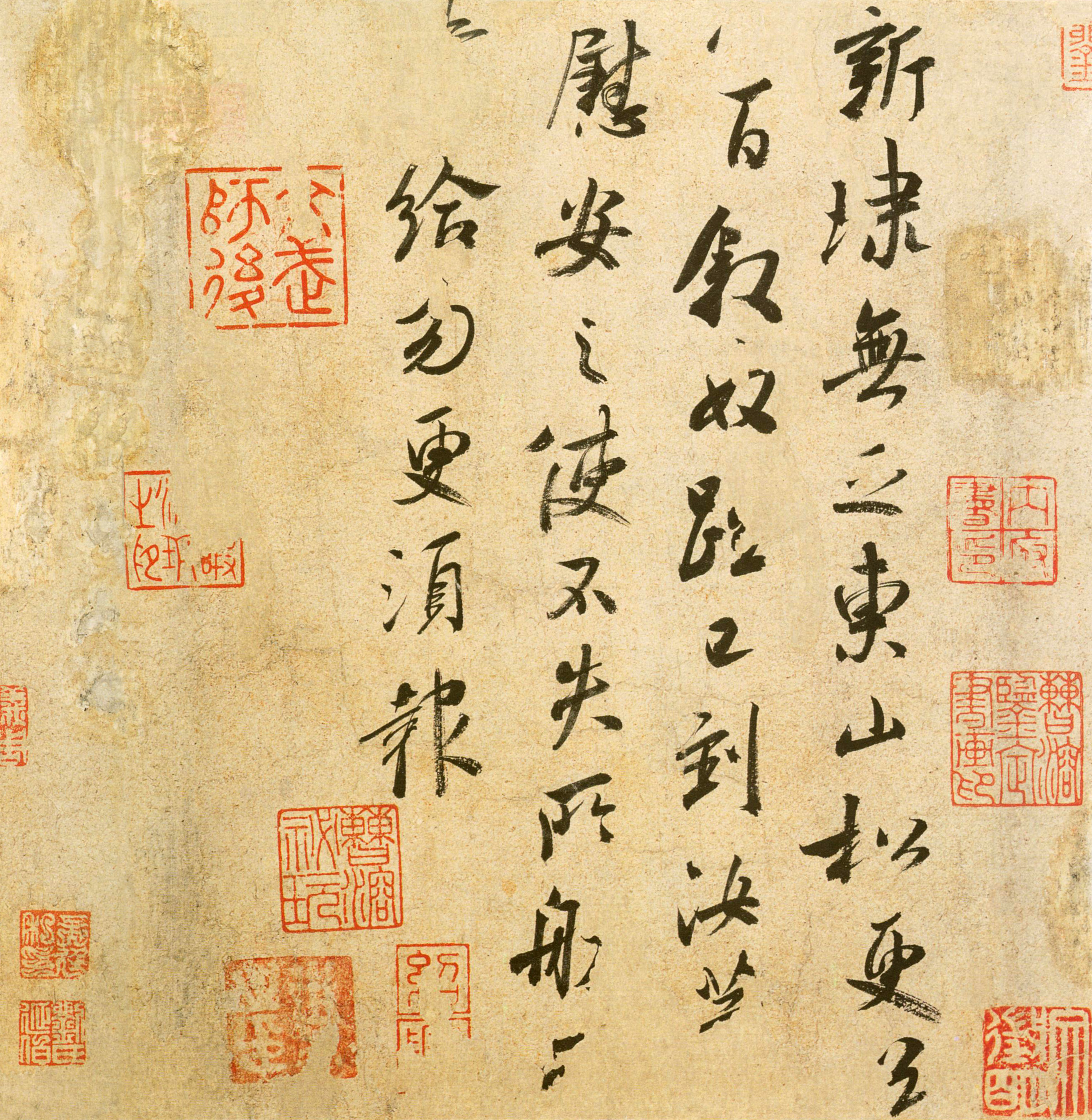 • 《东山松帖》释文:新埭无乏,东山松更送八百。叙奴□已到,汝等慰安之,使不失所。□□□给,勿更须报。此帖无款署和题跋。鉴藏印钤南宋“绍兴”连珠印、“内府书印”,明文征明、刘承禧、吴廷及清曹溶等印。另有两方古印(文不辨)。原有清乾隆内府诸印和乾隆题语,已被刮去。《东山松帖》是王献之写的一通信札,为断札,有四字磨灭。“埭”(音带)即堵水的堤。“东山松更送八百”应是一句,其意是需再植松八百棵作护堤、美化之用。此帖下笔婆娑,百态横生,萧散秀逸。宋内府《宣和书谱》、《中兴馆阁录》,明董其昌《容台集》,清孙承泽《庚子消夏记》、安岐《墨缘汇观》著录。刻入明吴廷《馀清斋法帖》、董其昌《戏鸿堂法帖》,清《三希堂法帖》