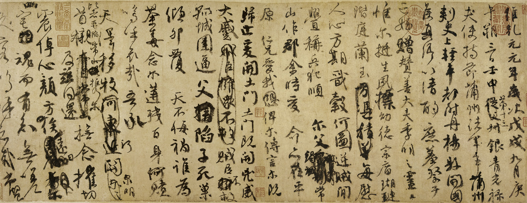 颜真卿行草书墨迹,8行,行41字。藏台湾故宫博物院。此帖又名《瀛州帖》,是著名的颜书墨迹之一。从帖的内容看,讲的是讨伐安禄山叛乱取得了胜利,颜真卿闻讯感到十分欣慰。据考,这段史事约发生在大历十年(775)或十一年(776),当时颜真卿是六十七或六十八岁。颜真卿曾是坚决反对安禄山叛乱、维护国家统一的盟主,后因反对权相元载弄权蔽主而遭排挤,大历元年(766)被贬至湖北、浙江、江西等地作地方官。尽管有这样的遭遇,从此帖看,这位“处江湖之远,则忧其君”的老臣,仍时刻系心于唐王朝的安危。此篇笔画纵横奔放,苍劲矫健、用笔飞动圆活,富于虚实变化。元鲜于枢称此帖与《祭侄文稿》都是“英风烈气,见于笔端”。