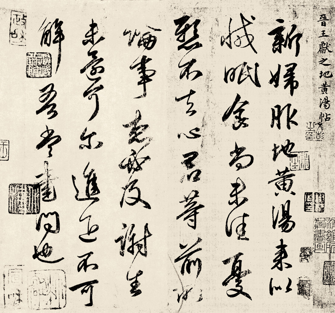 • 《地黄汤帖》,又名《新妇帖》,东晋王献之的草书作品。现存墨迹本是唐人摹本,晚清时期流入日本。此帖在《淳化阁帖》、《大观帖》、《三希堂法帖》、《筠清馆法帖》等历代著名丛帖中多有摹刻,受到广大学书者的重视。用笔外拓,笔画圆腴而纵逸。整幅字富有节奏感,开头“新妇”两个字是行书刚落笔速度较慢,写得凝重端稳,“服”字以后,渐渐放开,到第二行用笔已经很洒脱,笔画连绵宛曲,提按自然,轻重变化,充满韵律感,墨色浓淡、枯润相间,使得全帖个有散朗舒展的特点。原珍藏于宋内府,高宗赵构题签。为《淳化阁帖》卷第十所收。经贾似道,明代文徵明、王宠、文彭,清代孙承泽、吴荣光、罗振玉递藏后,于明治四十四年(1911)十二月三日,通过文求堂归中村不折(1866—1943)所有。卷末有文彭、常生、成亲王、英和等六家观记题跋。吴荣光获此帖时,模刻于所辑集帖《筠清馆帖》。