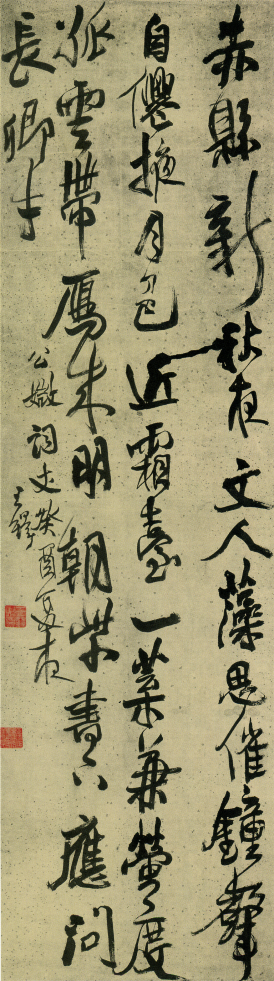 王铎,(公元1592-1652年)字觉斯,一字觉之。号嵩樵、十樵、石樵、痴庵、东皋长、痴庵道人、烟潭渔叟、雪塘渔隐、痴仙道人、兰台外史、雪山道人、二室山人、白雪道人、云岩漫士等。河南孟津人,世称“王孟津”,有“神笔王铎”之誉,明末清初时的著名书法家。明天启二年(1622),三十岁的王铎举进士及第,先后任翰林院庶吉士、编修、少詹事。弘光元年(1644),南明弘光帝任王铎为东阁大学士、次辅(副丞相)之职。次年入清,授礼部尚书。顺治九年(1652)病逝于孟津,享年六十一岁,赠太保,谥曰“文安”。王铎博学好古,工诗文。王铎的书法笔力雄健,长于布白,楷、行、隶、草,无不精妙,主要得力于钟繇、王羲之、王献之、颜真卿、米芾等各家,学米芾有乱真之誉,展现出其坚实的“学古”功底,学古且能自出胸臆,梁巘评其“书得执笔法,学米南宫之苍老劲健,全以力胜”。姜绍书《无声诗史》称其“行草书宗山阴父子(王羲之、王献之),正书出钟元常,虽模范钟王,亦能自出胸臆”。其传世作品主要有《拟山园帖》和《琅华馆帖》等,诸体悉备,名重当代,学者宗之。他在笔墨上的创新也是具有开拓性的,他的线条遒劲苍老,含蓄多变,于不经意的飞腾跳掷中表现出特殊个性,时而以浓、淡甚至宿墨,大胆制造线条与块面的强烈对比,形成一种强烈的节奏,不能不说他这有意无意之中的创举是对书法形式夸张对比的一大功绩。在他以前,还没有人能象他那样主动地追求“涨墨”效果。王铎的书法对中国书法后来的发展产生过巨大影响,甚至也波及到海外书坛,特别给东瀛书法影响颇深。