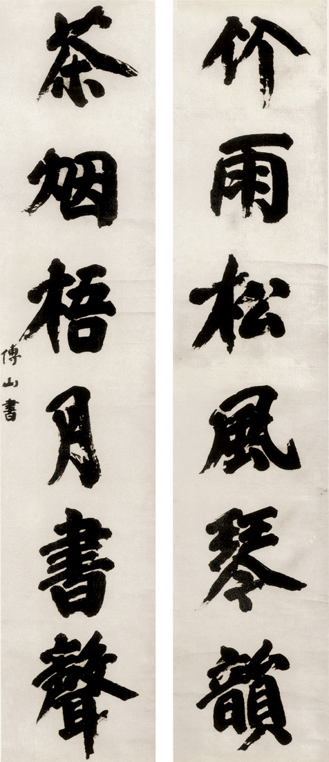 《丹枫阁记并跋》册页,共八页,绢本,为傅山先生手书(见上图)。傅山先生与山西名人戴廷既是三立书院的同窗好友,又是反清复明的志士仁人,两人来往频繁,关系非同一般。戴廷家境富裕,喜研经史,又爱藏古籍、书画、碑帖等。顺治17年(公元1660年),戴廷在昭余(今山西祁县)城内兴建了一座规模宏大的建筑,起名曰“丹枫阁”。“丹”、“枫”皆红色,寓意怀念朱明王朝。阁建成后成为明遗民秘密活动、饮酒吟诗、发泄悲愤的地方。戴廷为此还写了一篇《丹枫阁记》,以做梦和梦语等晦涩的语言,委婉地表述了怀念明朝、思念故人之情。写好后请好友傅山先生书之,并请题跋。傅山先生慨然允之,乘兴而书,一气呵成。此册页第一部分是抄写戴廷的文章,傅山先生以颜体笔意的行书写得认真仔细。写完后落款为昭余戴廷记、松侨老人真山书,下分别盖“戴廷印”阴文印,和“傅山印”阴文印各一枚。紧接着,傅山写跋,随想随写,越写情绪越激动,越写越流畅,行草变成草书。由于事先没有底稿,不免有写漏或写错的字。如旁边后来又加了“然”、“由”、“廷”等字。末了绢已写满,就在角落里紧紧地挤着写了结束语,“既为书之,附识此于后”。由于字已写满整个绢面,傅山就在这几个字上盖了两方自己的阴文印,由于与字重迭,印文看不清,用放大镜仔细看,下面的一枚是“傅山印”,上面的一枚实在无法辨认。此《跋》在《霜红龛集》与《傅山全书》中均有收录。