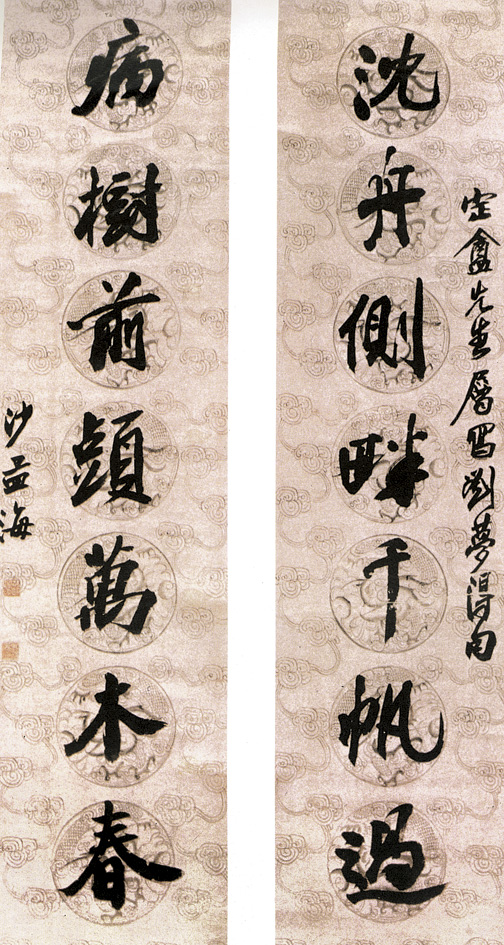 - 沙孟海(1900-1992年)原名文若,中年后以字行。号石荒、沙村、决明、兰沙等。浙江鄞县人。早年从冯君木学古典诗文,从吴昌硕习书法、篆刻。后又与著名学者朱疆村、况蕙风、章太炎、马一浮等交往,受益良多。曾就读于慈溪锦堂学校,毕业于浙东第四师范学校。曾为浙江大学中文系教授,1963年起在浙江美术学院兼课,1979年起为书法、篆刻专业研究生导师。历任浙江省文物管理委员会常务委员、浙江省博物馆名誉馆长、中国书法家协会副主席、浙江省书法家协会主席、西泠印社社长、西泠书画院院长、浙江考古学会名誉会长等职。其书法远宗汉魏,近取宋明,于钟繇、王羲之、欧阳询、颜真卿、苏轼、黄庭坚诸家,用力最勤,且能化古融今,形成自己"雄强"书风。兼擅篆、隶、行、草、楷诸书,所作榜书大字,雄浑刚健,气势磅礴,堪称旷世罕见。沙氏学问渊博,识见高明,于语言文字、文史、考古、书法、篆刻等均深有研究。主要著作有《印学史》、《沙孟海书法集》、《沙孟海真行草书集》、《兰沙馆印式》、《中国书法史图录》、《沙孟海论书文集》等。并主编《中国新文艺大系?书法卷》等。沙孟海是中国当代书坛巨擘,现代高等书法教育的先驱之一。