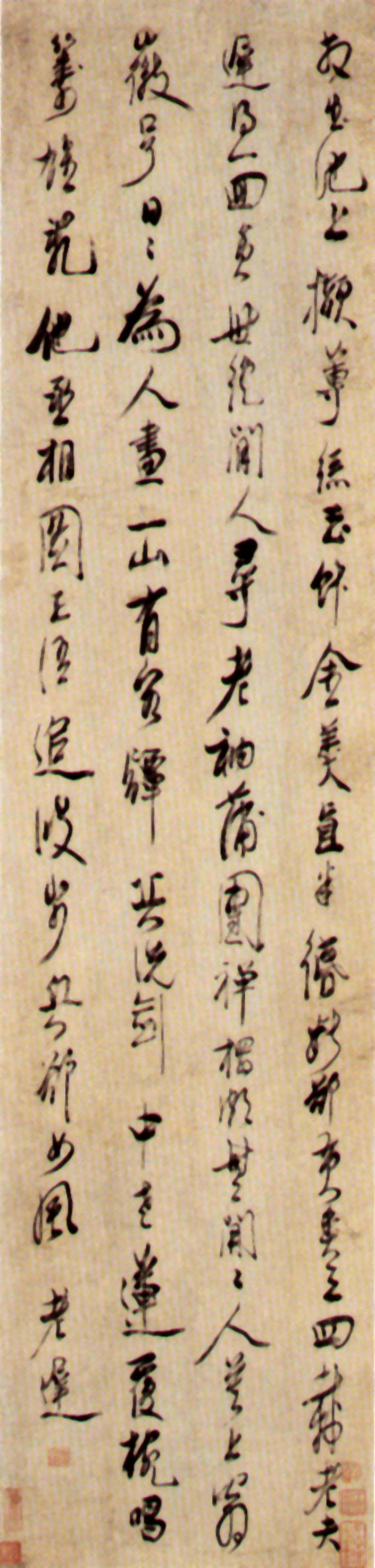 陈洪绶(1598-1652):字章侯,幼名莲子,一名胥岸,号老莲,别号小净名、晚号老迟、悔迟,又号悔僧、云门僧。浙江诸暨枫桥人。明末富有革新精神和独创风格的画家。祖上为官宦世家,至其父家道中落。陈洪绶幼年早慧,诗文书法俱佳,曾随蓝瑛学画花鸟。成年后到绍兴蕺山师从著名学者刘宗周,深受其人品学识影响。崇祯三年(1630)应会试未中。崇祯十二年(1639)到北京宦游,与周亮工过从甚密。后以捐赀入国子监,召为舍人,奉命临摹历代帝王像,因而得观内府所藏古今名画,技艺益精,名扬京华,与崔子忠齐名,世称“南陈北崔”。明朝覆没后,清兵人浙东,陈洪绶避难绍兴云门寺,削发为僧,一年后还俗。晚年学佛参禅,在绍兴、杭州等地鬻画为业。陈洪绶生性怪僻,愤世妒俗,身历忧患之时,所交师友多为正义之士。著有《宝纶堂集》。陈洪绶虽不以书法名世,但其于书法艺术方面所取得的成就也是相当惊人的。陈洪绶作书严循中锋用笔之法,他深谙掌竖腕平执笔的奥秘。其间虽小有以侧锋取妍处,但他能立即将笔调整过来。如此高超的控笔能力,无疑只能以掌竖腕平执笔法为之方可。再有,书法所要求的“回藏”、“提按”、“顿挫”、“绞衄”、“呼应”等等笔法要略,在他的运笔过程中,似无一处有缺憾,只是他做了无痕迹罢了,这也正是大相不雕、信言不美、修养至炉火纯青境界的具体体现。