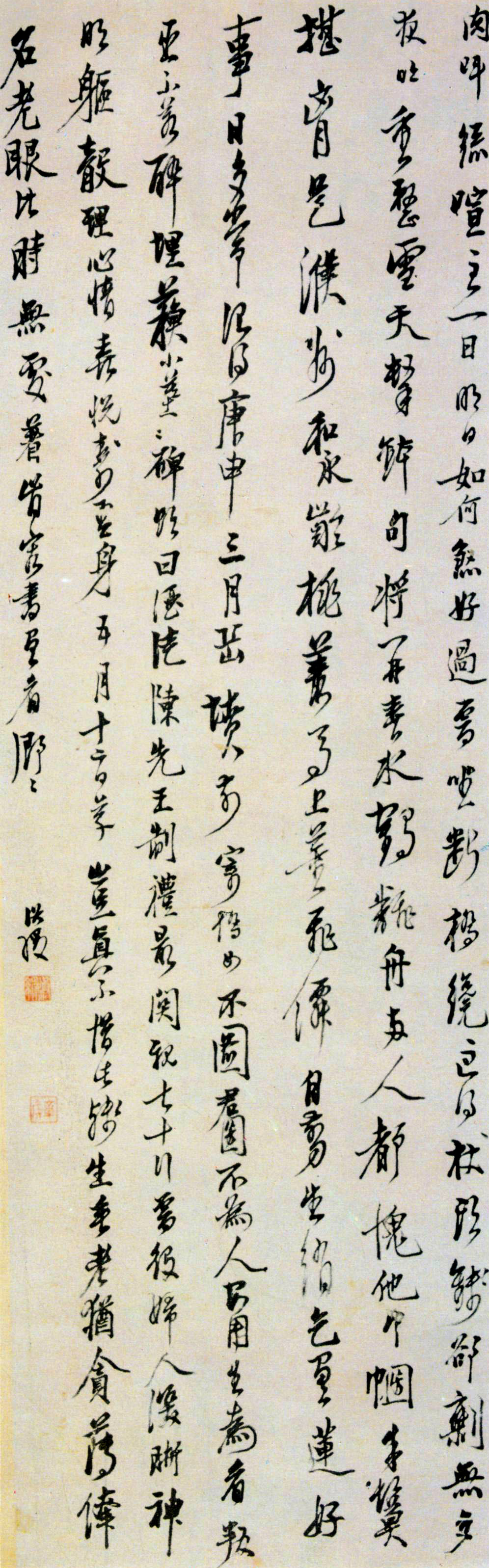 陈洪绶(1598-1652):字章侯,幼名莲子,一名胥岸,号老莲,别号小净名、晚号老迟、悔迟,又号悔僧、云门僧。浙江诸暨枫桥人。明末富有革新精神和独创风格的画家。祖上为官宦世家,至其父家道中落。陈洪绶幼年早慧,诗文书法俱佳,曾随蓝瑛学画花鸟。成年后到绍兴蕺山师从著名学者刘宗周,深受其人品学识影响。崇祯三年(1630)应会试未中。崇祯十二年(1639)到北京宦游,与周亮工过从甚密。后以捐赀入国子监,召为舍人,奉命临摹历代帝王像,因而得观内府所藏古今名画,技艺益精,名扬京华,与崔子忠齐名,世称“南陈北崔”。明朝覆没后,清兵人浙东,陈洪绶避难绍兴云门寺,削发为僧,一年后还俗。晚年学佛参禅,在绍兴、杭州等地鬻画为业。陈洪绶生性怪僻,愤世妒俗,身历忧患之时,所交师友多为正义之士。著有《宝纶堂集》。陈洪绶虽不以书法名世,但其于书法艺术方面所取得的成就也是相当惊人的。陈洪绶作书严循中锋用笔之法,他深谙掌竖腕平执笔的奥秘。其间虽小有以侧锋取妍处,但他能立即将笔调整过来。如此高超的控笔能力,无疑只能以掌竖腕平执笔法为之方可。再有,书法所要求的“回藏”、“提按”、“顿挫”、“绞衄”、“呼应”等等笔法要略,在他的运笔过程中,似无一处有缺憾,只是他做了无痕迹罢了,这也正是大相不雕、信言不美、修养至炉火纯青境界的具体体现。