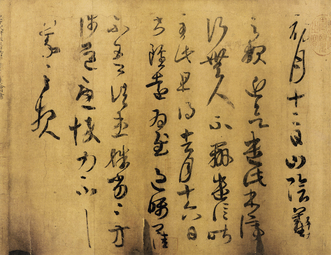 • 释文:初月十二日山阴羲之报近欲遣此书济行无人不辨遣信昨至此且得去月十六日书虽远为慰过嘱卿佳不吾诸患殊劣殊劣方陟道忧悴力不具羲之报。此帖为《万岁通天帖》第二帖,草书,藏辽宁博物馆。王羲之父名“正”,为避父讳,“正月”书为“初月”。此帖是王羲之留存至今最好的书帖之一。和王羲之其他草书比较,具有古意,可能是较早的作品。此帖用笔、结字和章法都有很多特点。如其中倒数第二行之“道忧怀”,末行之“报”字,一点一画均非直过,而是具有丰富的变化。如“忧”字的首笔和末笔,“怀”字的左侧竖画,“报”字的最后一笔,笔画或短或长,或藏锋或露锋,都呈曲势,非一带而过,中间充满了微妙的变化。翁方纲所谓“中过”,包世臣所谓“善用曲”,“古人雄厚恣肆令人断不可企及者,则在画之中截”等等,于此帖皆可领略一二。用笔以中锋为主,有些字如“山”字、“报”字使用侧锋也十分明显。结字大小不一,或长或短,或平正或倚斜,皆随字形和性情而定,行字不求垂直匀称,行距不求密疏划一,这就决定了此帖的错落跌宕、变幻莫测的整个面貌。这种情况同当时人们追求自然潇洒的社会风气有关。