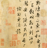 《东山松帖》释文:新埭无乏,东山松更送八百。叙奴□已到,汝等慰安之,使不失所。□□□给,勿更须报。此帖无款署和题跋。鉴藏印钤南宋“绍兴”连珠印、“内府书印”,明文征明、刘承禧、吴廷及清曹溶等印。另有两方古印(文不辨)。原有清乾隆内府诸印和乾隆题语,已被刮去。《东山松帖》是王献之写的一通信札,为断札,有四字磨灭。“埭”(音带)即堵水的堤。“东山松更送八百”应是一句,其意是需再植松八百棵作护堤、美化之用。此帖下笔婆娑,百态横生,萧散秀逸。宋内府《宣和书谱》、《中兴馆阁录》,明董其昌《容台集》,清孙承泽《庚子消夏记》、安岐《墨缘汇观》著录。刻入明吴廷《馀清斋法帖》、董其昌《戏鸿堂法帖》,清《三希堂法帖》