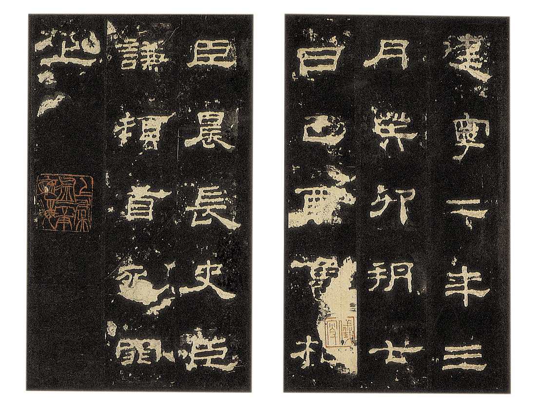 • 《汉史晨碑奏铭》,又称《史晨碑》或《史晨前碑》、《汉史晨谒孔严后碑》、又称《史晨后碑》,两碑同刻一石两面。〈史晨前碑〉奏铭建宁二年碑刻后,又追述建宁元年到官,刻在背面。有谓先刻元年,转后面。前碑,隶书,无额,十七行,行三十六字,后碑,隶书,十四行,行三十六字山东曲阜孔庙。〈史晨前后碑〉为著名汉碑之一,碑字结体方整,端庄典雅。笔势中敛,波挑左右开张,疏密有致,行笔圆浑淳厚,有端庄肃穆的意度,其挑脚虽已流入汉末方棱的风气,但仍有姿致而不板滞。清方朔以为〈晨史碑〉”书法则肃括宏深,沈古遒厚,结构与意度皆备,洵为庙堂之品,八分正宗也“(见〈枕经堂题跋〉)。何绍基说:”东京分书碑尚不乏,八凡遇一碑刻,则意度各别,可想古人变化之妙。要知东京各碑结构,方整中藏,变化无穷,魏、吴各刻便形板滞矣“(〈史晨碑〉跋)。此本“秋”字完好,为明拓精本前碑全称《汉鲁相史晨奏祀孔子庙碑》。隶书,两面刻,前碑刻于东汉建宁二年(166年)三月。17行,行36字。后碑刻于建宁元年(165年)四月。14行,行36字。现存山东曲阜孔庙。碑文记载鲁相史晨祭祀孔子的情况。后碑全称《汉鲁相史晨飨孔庙碑》,记载孔庙祀孔之事。文后有武周正书题记四行。《史晨碑》为著名的汉碑之一。前后碑字体如出一人之手,传为蔡邕书。结字工整精细,中敛而四面拓张,波挑分明,呈方棱形,笔致古朴,神韵超绝,为汉隶成熟期方整平正一路书法的典型,对后世有深远的影响。明郭宗昌谓其“分法复尔雅超逸,可为百代模楷,亦非后世可及”。清万经《分隶偶存》评云:“修饬紧密,矩度森然,如程不识之师,步伍整齐,凛不可犯,其品格当在《卒史》(《乙瑛》)、《韩勑》(《礼器》)之右。”方朔《枕经金石跋》云:‘书法则肃括宏深,沉古遒厚,结构与意度皆备,洵为庙堂之品,八分正宗也。”杨守敬《平碑记》云:“昔人谓汉隶不皆佳,而一种古厚之气自不可及,此种是也。”