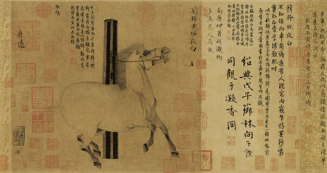 韩干,京都地区人。生卒年不详,今陕西西安人,唐杰出画家。官太府寺丞。擅画肖像人物,尤工画马,着重描绘马的风采神态,对后世影响很大。画迹有《姚崇像》、《安禄山像》、《玄宗试马图》、《宁王调马打球图》、《龙朔功臣图》,均录于《历代名画记》,《内厩御马图》、《圉人调马图》、《文皇龙马图》等52件,辑于《宣和画谱》。传世作品有《牧马图》,录于《故宫名画三百种》。