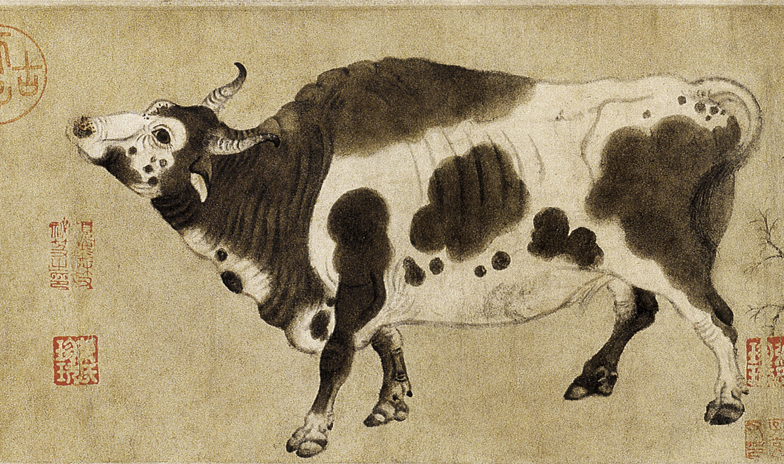 - 韩滉(723-787)〔唐〕字太冲,长安(今陕西西安)人,少师休之子,以荫补骑曹参军。性节俭,衣裘茵袵,十年一易,居处仅避风雨,不为家人资产,幼有美名,天资聪明,善《易》与《春秋》,好鼓琴。能书善画,长于隶书;章草学梁侍中,草书得张旭笔法,亦工篆草。擅画农村风俗景物,写牛、羊、驴等走兽神态生动,尤以画牛“曲尽其妙”。南宋陆游赞其画:“每见村童牧牛于风林烟草之间,便觉身在图画,起辞官归里之望。”与韩干齐名,画迹有《李德裕见客图》《尧民击壤图》《田家风俗图》等36件,着录于《宣和画谱》。传世作品有《五牛图》卷,纸本,设色,笔墨稳健,恣态各异,生动有神;《文苑图》卷,绢本,设色,现均藏故宫博物院。