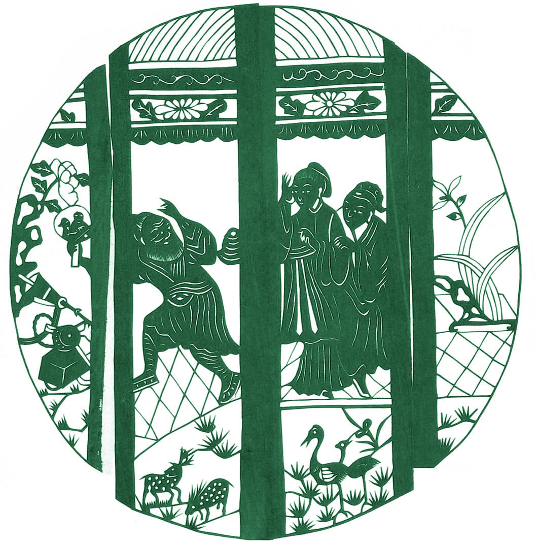 • 此窗花用老红纸剪成,人物全用阴纹表现,面部都是“满脸”。画面情节据说是山东五音戏中已经失传的剧目磨底镜