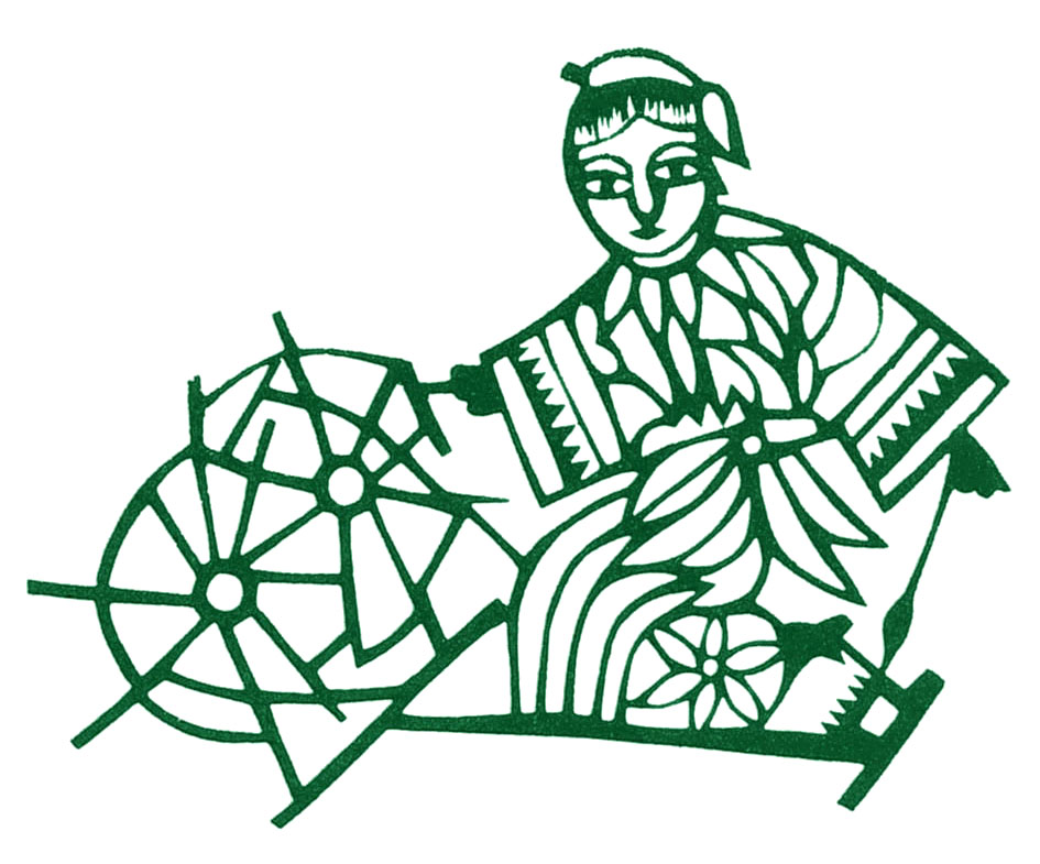 • 此幅剪纸表现一妇女纺织时一手摇纺车,一手拿棉絮的动态,纺车、人物衣纹及脸部均用阳纹表现。