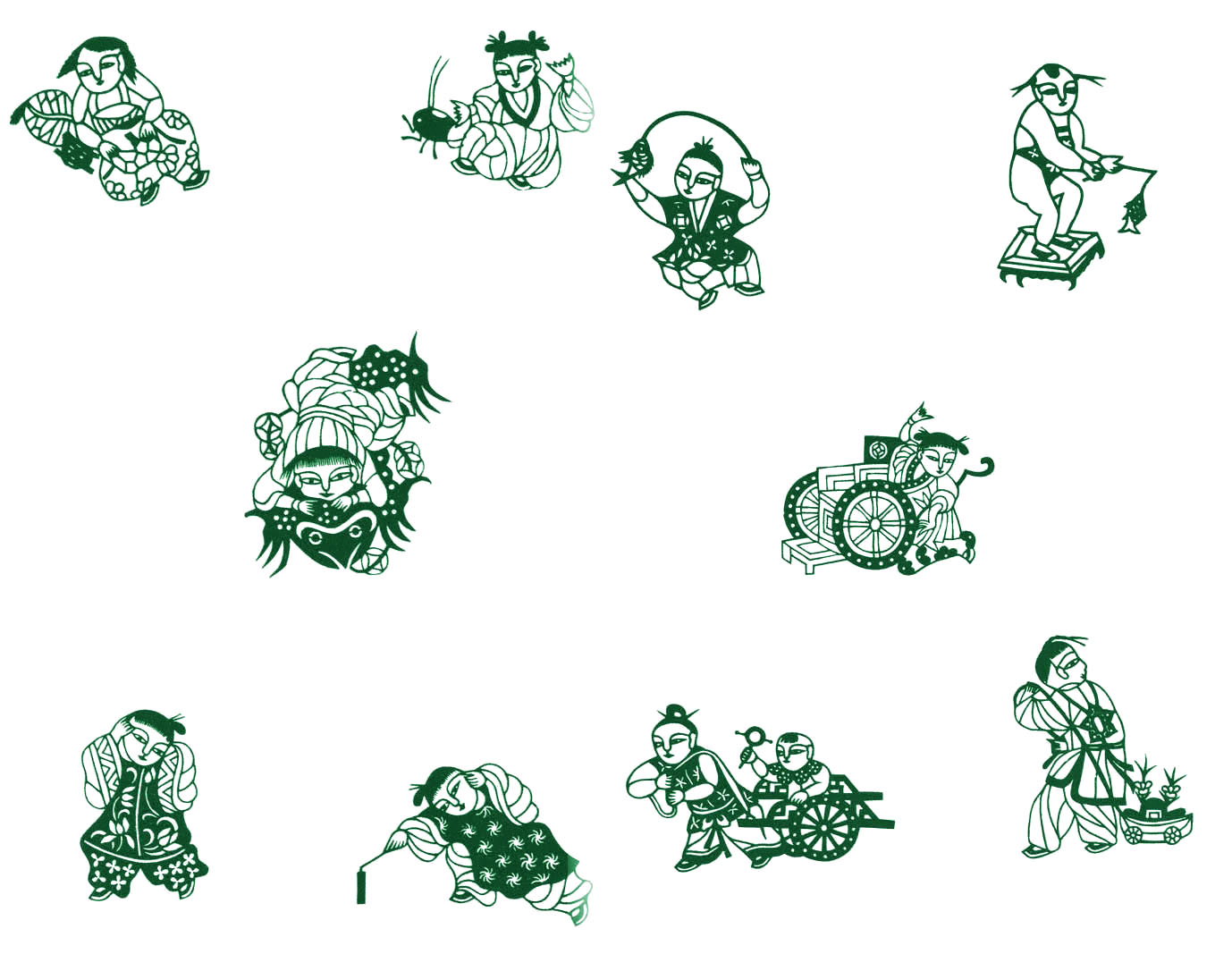 • 儿童形象生动活泼,有的钓鱼,有的拉车,有的玩猫,有的斗蛐蛐,有的点爆竹。