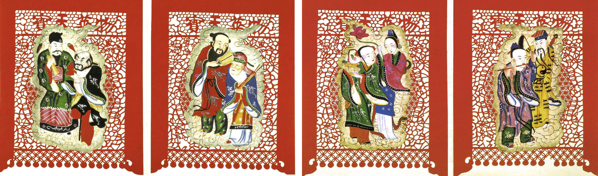 • 八仙分为四组,立于中堂,系以木版刻印,后以手工敷色,色彩艳丽,形象生动。
