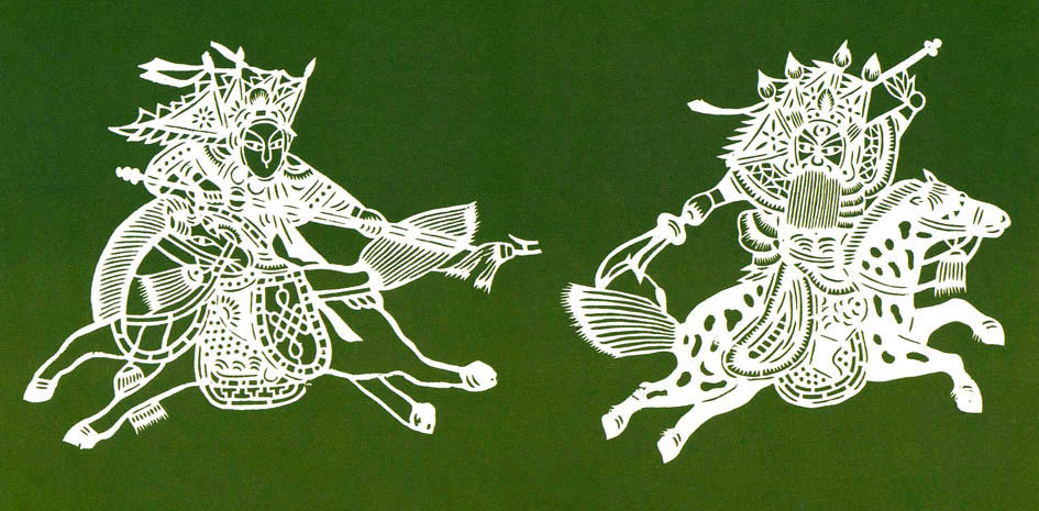 • “刀马人”剪纸多取材于历史故事,此作展现两位大将在马上追逐战斗场面。