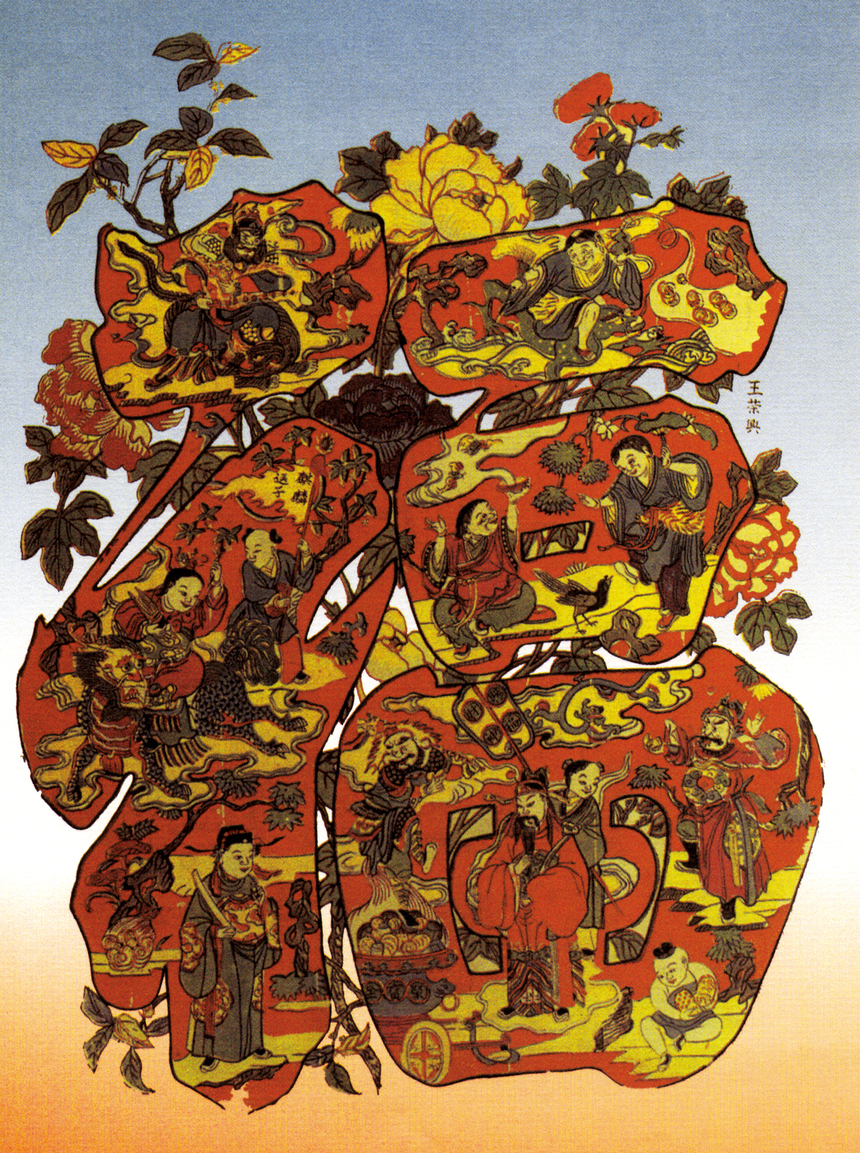 • 福字中,依笔画顺序,分别绘入天师镇宅,麒麟送子,天官,刘海戏金蟾,和合二仙,赐福财神等吉祥图案。