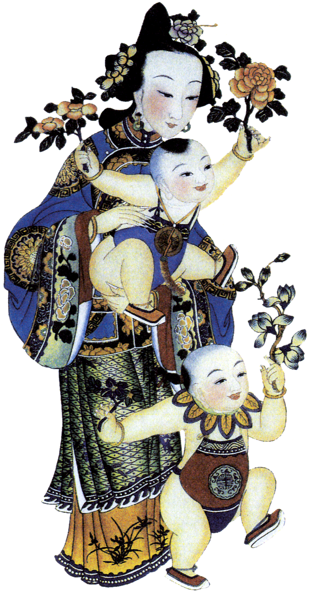 • 画中肥硕的孩子,细心的母亲,说出了普通人民的心声,也代表了民间的年节愿望,幸福,美满,安康。