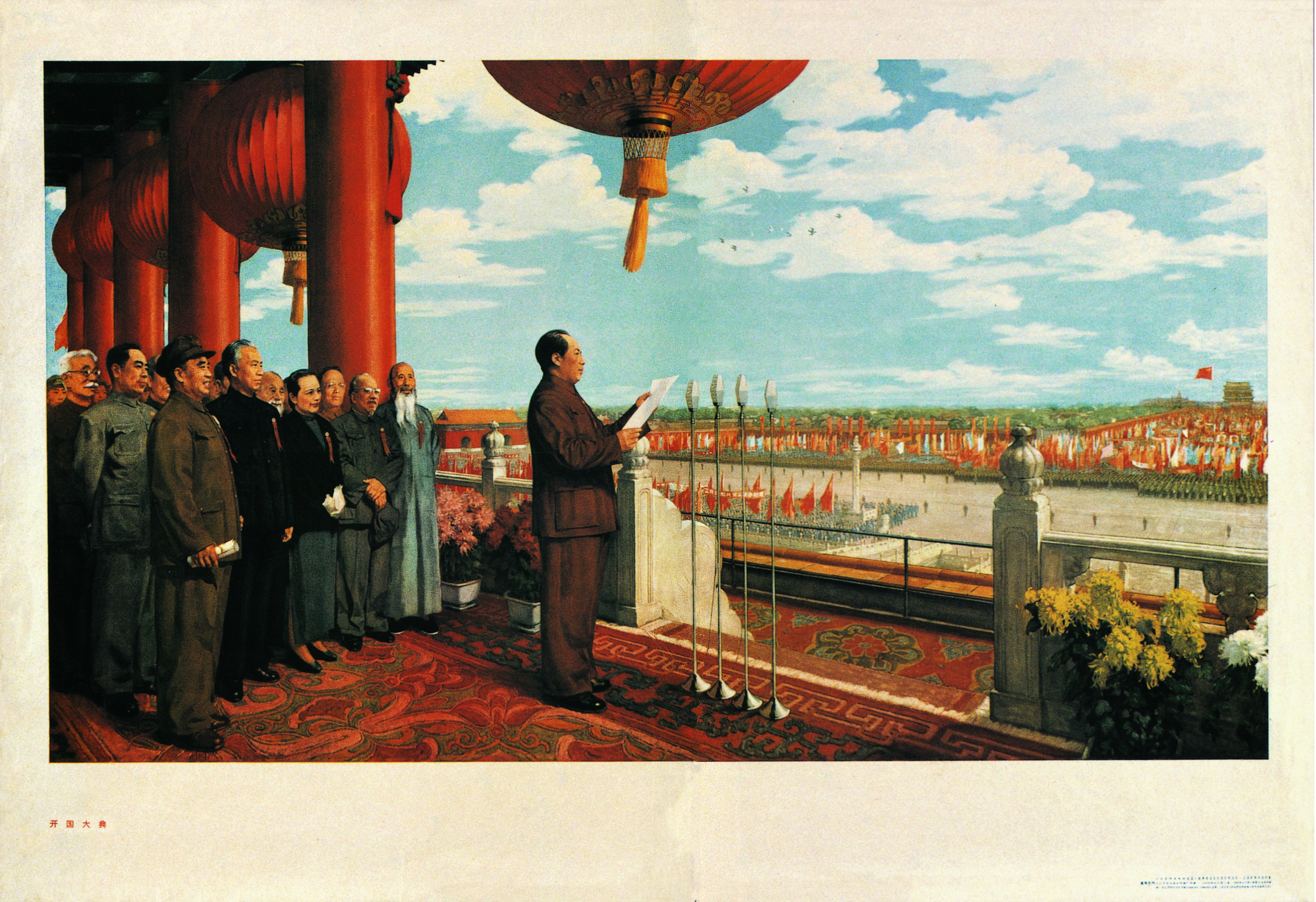 (1949年10月1日,中国各族人民伟大的领袖毛泽东主席在北京天安门上宣布中华人民共和国成立。从此,中国各族人民在中国共产党的领导下,结束了长斯被压迫、奴役的历史,保证我国能够通过和平道路,过渡到社会主义社会。)