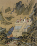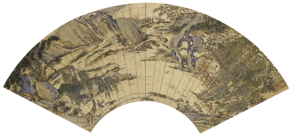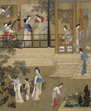 仇英 (约1509—1551)明代画家。字实父,号十洲。太仓(今属江苏)人,寓居苏州。初为漆工,后改学画,师周臣。以卖画为生,精于摹古,不拘一家一派。粉图黄纸,落笔乱真。他以广泛的题材和工整细丽的风格,适应当时地主富商的需要。尤擅长人物仕女画,既工设色,又善水墨、白描,能运用多种笔法表现不同的对象。画山水,喜设大青绿色,用笔萧疏,意境简远,工巧入神。他临摹的古画很多,对赵伯驹、赵松雪画用功颇深。偶作花鸟亦清丽有逸致