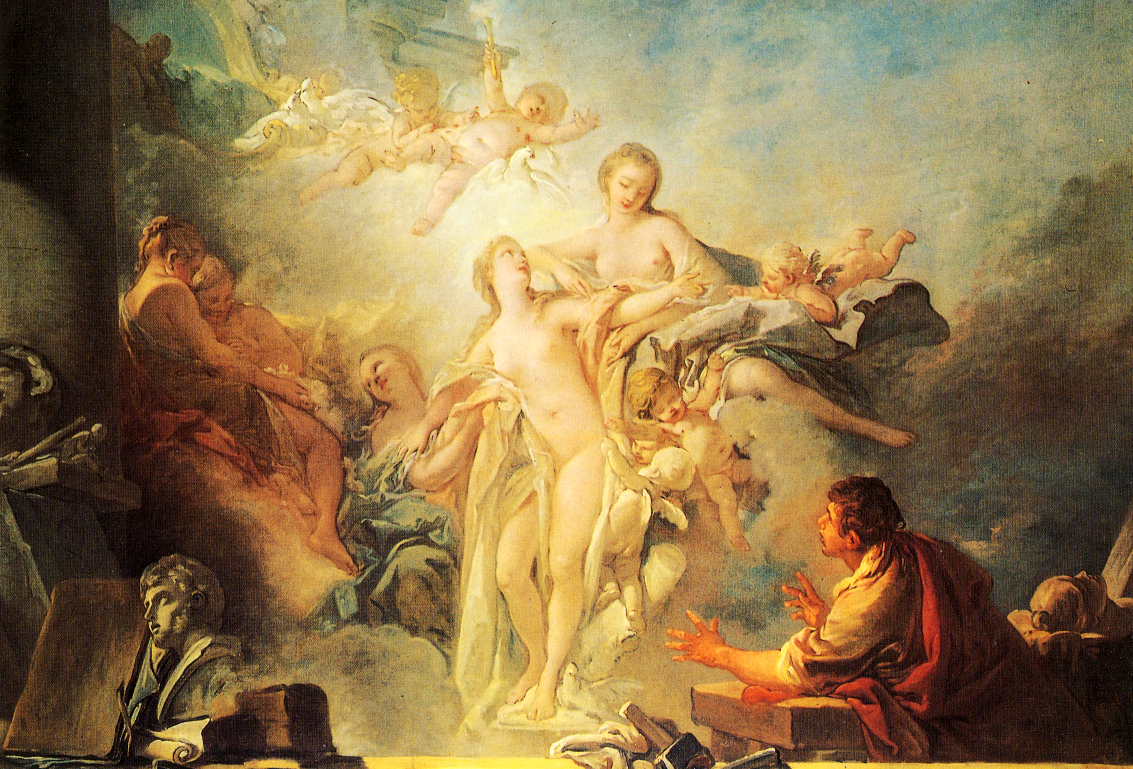 弗兰西斯·布歇(Francois Boucher,1703~1770年 )是一位多才多艺的法国宫廷画师。他的创作除绘画以外,还涉及版画、家具与服装设计、舞台背景等。布歇从小有神童之称,聪慧过人,是罗可可艺术的创始人弗朗索瓦·勒穆的学生。1723年,布歇在巴黎美术学院获一等罗马大奖,以后又去意大利深造。回国后很快成名,成为美术学院教授、首席宫廷画家。他的成功也得益于当时宫廷中最有权势的蓬帕杜侯爵夫人的支持。