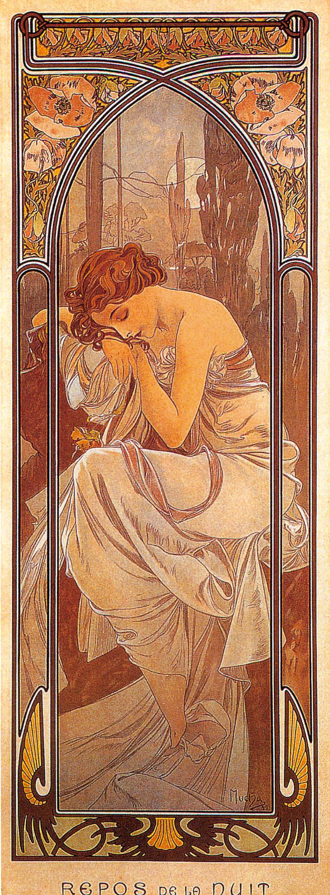 阿方斯·穆夏是20世纪初叶巴黎流行的“新艺术”的代表画家。他的新艺术美女海报绘画,在20世纪初期即闻名欧美,晚年,在爱国心的驱使下他回归祖国,并完成“斯拉夫史诗”系列20幅联作,谨以此献给捷克人民。 阿方斯·穆夏生于捷克南部的莫拉维亚, 1885年,阿方斯·穆夏到慕尼黑艺术学院进行学习。1887年,穆夏到巴黎朱利安学院学习,为了谋生,穆夏承接了大量为书籍和杂志绘制插图的工作。为著名的女演员莎拉·伯恩哈特新排的戏剧画招贴画。使阿方斯·穆夏在法国赢得了声誉,慕夏成名的巅峰是在1900年. 他的理论著作《décoratifs》和人物画作《décoratives》使他的艺术装饰风格和实用性产生了巨大的影响. “穆夏风格”作为巴黎热门典型元素作让所有女性纷纷效仿他图中的女性的形象,阿方斯·穆夏在1900年参加巴黎展览用他为波黑亭制作的墙面装饰制造了轰动。1904穆夏去美国,第一次世界大战爆发,他开始致力于创作一组20幅大型系列油画,创作主题为“斯拉夫史诗”。 1939年3月16日,德军入侵捷克吞并波希米亚和摩拉维亚后不久后,阿方斯·穆夏于1939年7月14日在布拉格逝世。 新艺术运动是19世纪末、20世纪初在欧洲和美国产生和发展的一次影响面相当大的装饰艺术运动,时间跨度达30年之久的艺术运动。 穆夏的创作经历几乎就是“新艺术运动”的一个缩影,他的创作涵盖了招贴画、油画、雕塑、书籍插图、建筑设计、室内装饰、首饰设计、彩色玻璃窗画等许多艺术领域,还包括家具和咖啡壶等日用品的设计以及大量的商品包装画。而其中他那些被称为“穆夏风格”的招贴画展现了成熟的追求极端唯美的新艺术曲线装饰风格,几乎成为新艺术招贴画的同义词。