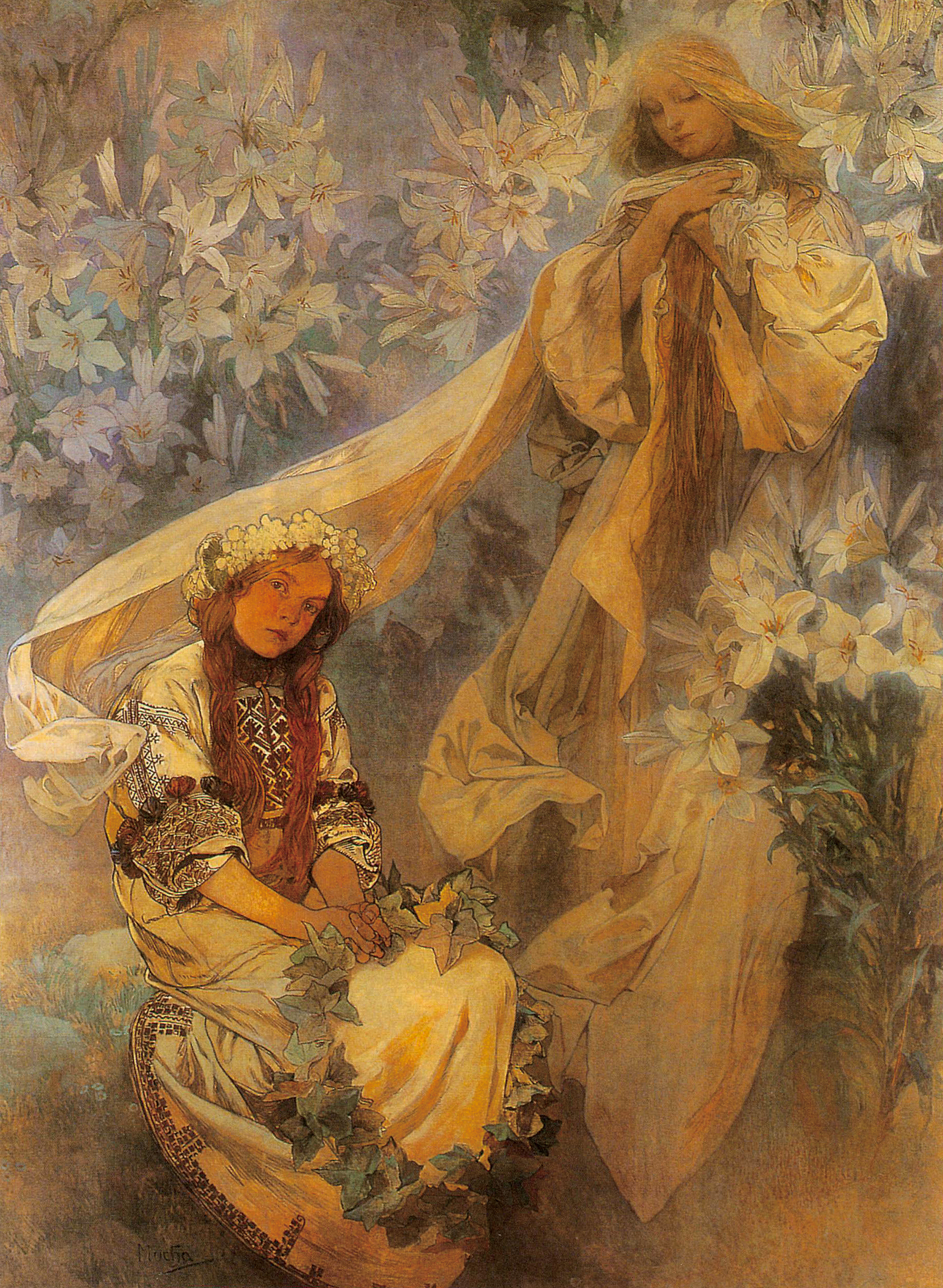 阿方斯·穆夏是20世纪初叶巴黎流行的“新艺术”的代表画家。他的新艺术美女海报绘画,在20世纪初期即闻名欧美,晚年,在爱国心的驱使下他回归祖国,并完成“斯拉夫史诗”系列20幅联作,谨以此献给捷克人民。 阿方斯·穆夏生于捷克南部的莫拉维亚, 1885年,阿方斯·穆夏到慕尼黑艺术学院进行学习。1887年,穆夏到巴黎朱利安学院学习,为了谋生,穆夏承接了大量为书籍和杂志绘制插图的工作。为著名的女演员莎拉·伯恩哈特新排的戏剧画招贴画。使阿方斯·穆夏在法国赢得了声誉,慕夏成名的巅峰是在1900年. 他的理论著作《décoratifs》和人物画作《décoratives》使他的艺术装饰风格和实用性产生了巨大的影响. “穆夏风格”作为巴黎热门典型元素作让所有女性纷纷效仿他图中的女性的形象,阿方斯·穆夏在1900年参加巴黎展览用他为波黑亭制作的墙面装饰制造了轰动。1904穆夏去美国,第一次世界大战爆发,他开始致力于创作一组20幅大型系列油画,创作主题为“斯拉夫史诗”。 1939年3月16日,德军入侵捷克吞并波希米亚和摩拉维亚后不久后,阿方斯·穆夏于1939年7月14日在布拉格逝世。 新艺术运动是19世纪末、20世纪初在欧洲和美国产生和发展的一次影响面相当大的装饰艺术运动,时间跨度达30年之久的艺术运动。 穆夏的创作经历几乎就是“新艺术运动”的一个缩影,他的创作涵盖了招贴画、油画、雕塑、书籍插图、建筑设计、室内装饰、首饰设计、彩色玻璃窗画等许多艺术领域,还包括家具和咖啡壶等日用品的设计以及大量的商品包装画。而其中他那些被称为“穆夏风格”的招贴画展现了成熟的追求极端唯美的新艺术曲线装饰风格,几乎成为新艺术招贴画的同义词。