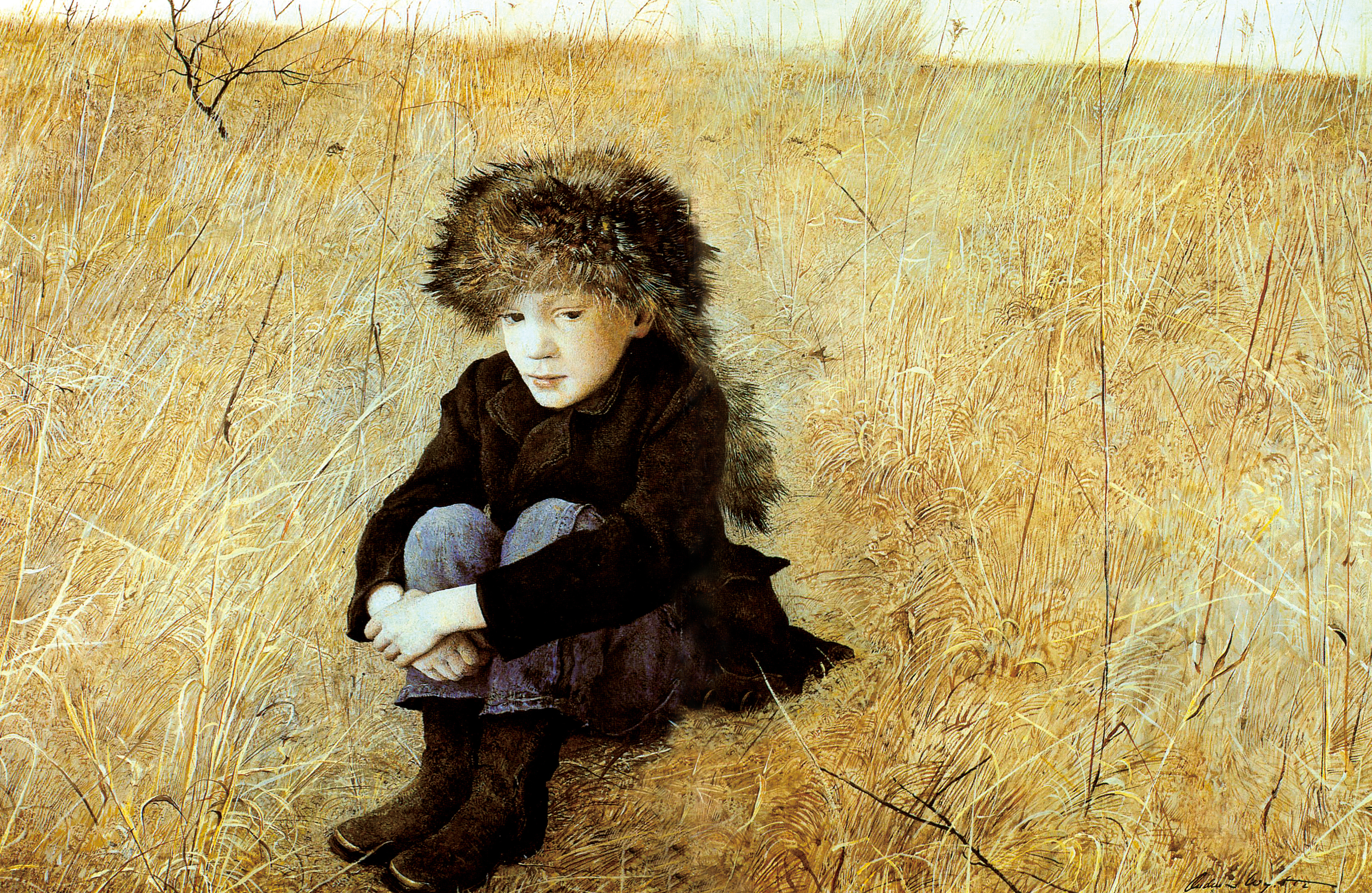 安德鲁·怀斯(Andrew Wyeth,1917~?),是美国20世纪最伟大的画家之一。他15岁开始学画,20岁举办个人画展,先后被三届美国总统肯尼迪、里根、布什分别授予“总统自由勋章”、“金质总统勋章”和“国会金质章”。他出生于绘画世家,父亲安·康·怀斯是20世纪二三十年代美国有名的插图画家,五兄妹中有四人是画家,甚至他的儿子詹姆斯后来也成为画家。怀斯的作品以缅因州的乡村人物和景色为主,采用蛋彩混合颜料绘成。画面描绘精确,技法细腻,显示出他高超的写实能力。