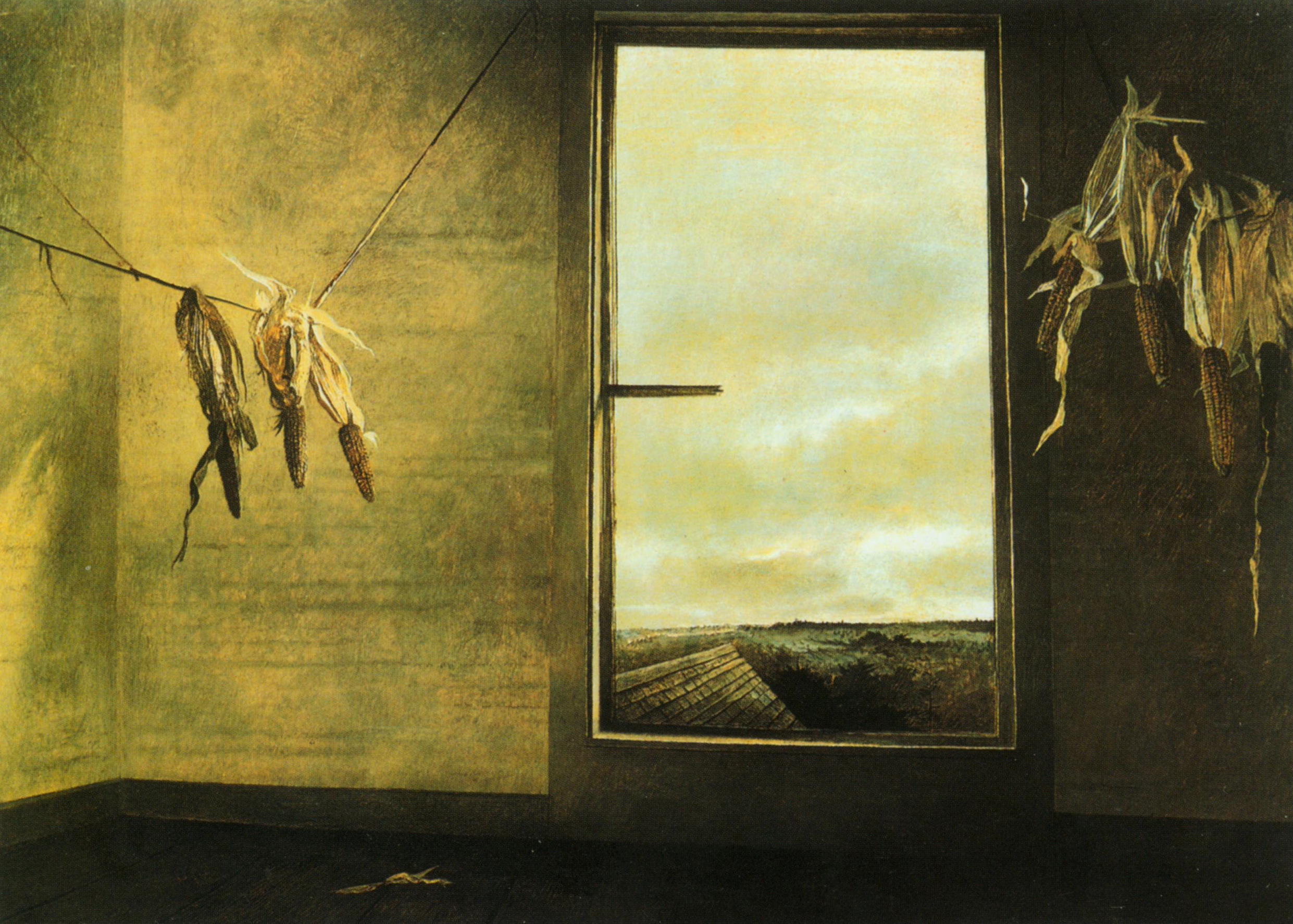 安德鲁·怀斯(Andrew Wyeth,1917~?),是美国20世纪最伟大的画家之一。他15岁开始学画,20岁举办个人画展,先后被三届美国总统肯尼迪、里根、布什分别授予“总统自由勋章”、“金质总统勋章”和“国会金质章”。他出生于绘画世家,父亲安·康·怀斯是20世纪二三十年代美国有名的插图画家,五兄妹中有四人是画家,甚至他的儿子詹姆斯后来也成为画家。怀斯的作品以缅因州的乡村人物和景色为主,采用蛋彩混合颜料绘成。画面描绘精确,技法细腻,显示出他高超的写实能力。
