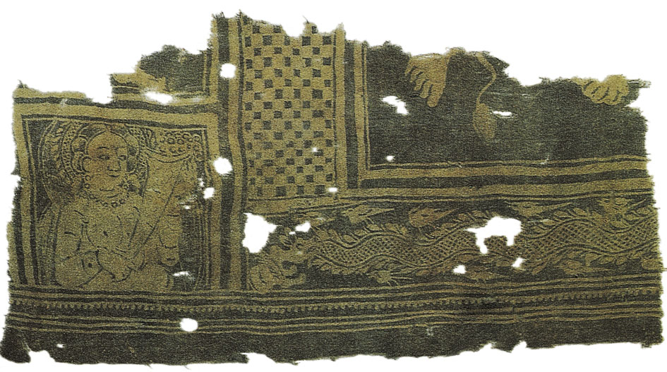 • 此残片左下角方框内为一袒胸,持角杯,头后饰圆光的佛像。右侧栏框内为龙及鸟纹边饰,其馀大部分已缺失。现藏新疆维吾尔自治区博物馆。
