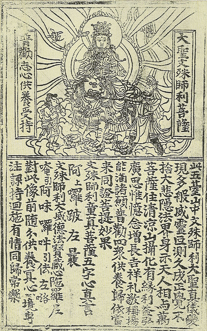 • 文殊骑狮,手持如意,神态安详,童子合掌作拜谒状,牵狮人作西域装束,下栏刻五字心真言