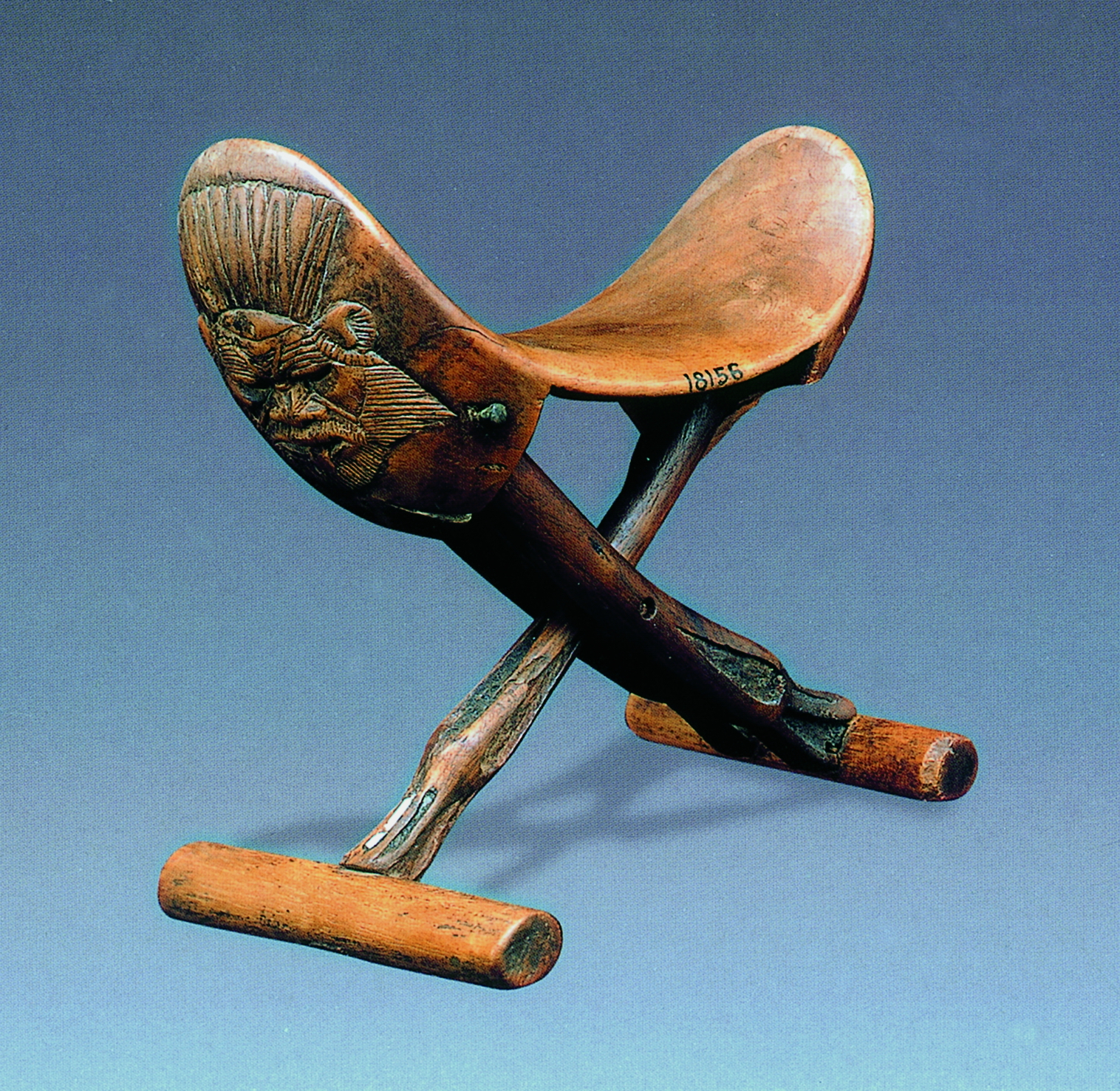 • 此枕模仿上层阶级的折叠凳,枕面呈凹弧形,枕面两端下部各刻画家庭保护神贝斯的正面头像。这在埃及艺术中是独一无二的,其头部犹如狮子,表情俏皮。