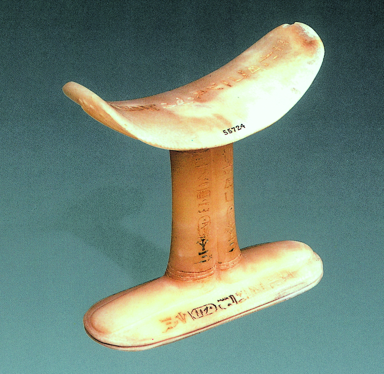 • 这个雪花石膏枕头设计独特,枕面如同张开的双手,其下仔细刻画着伸出的手指。枕头的支撑柱上部模仿人的双臂,下部则变成脚踝,底座则如同两只后跟相抵的脚。