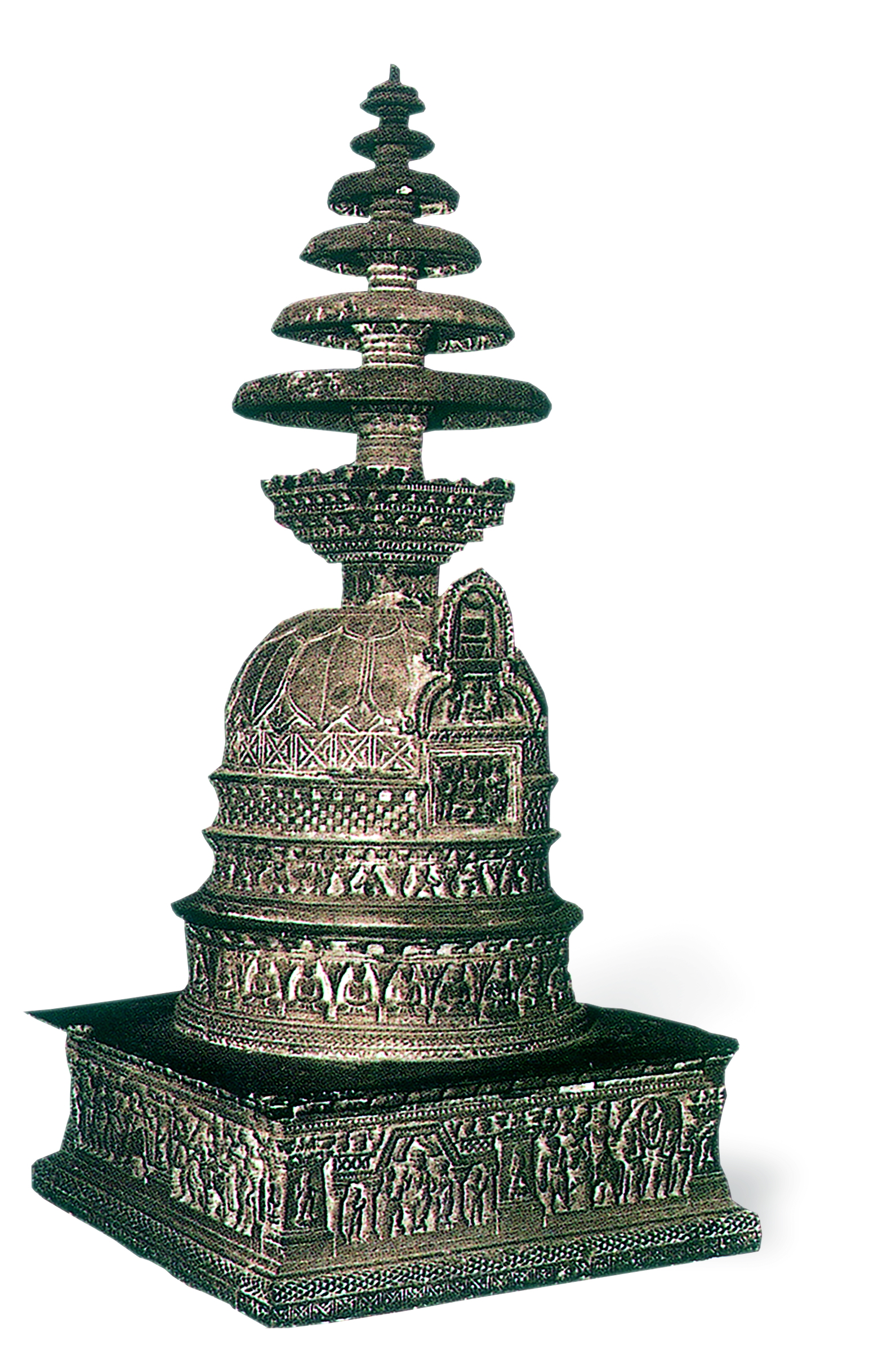 • 此塔出土于罗利亚坦亥伊,方形基上有三层圆形基,顶上有呈圆锥状的六层伞盖。