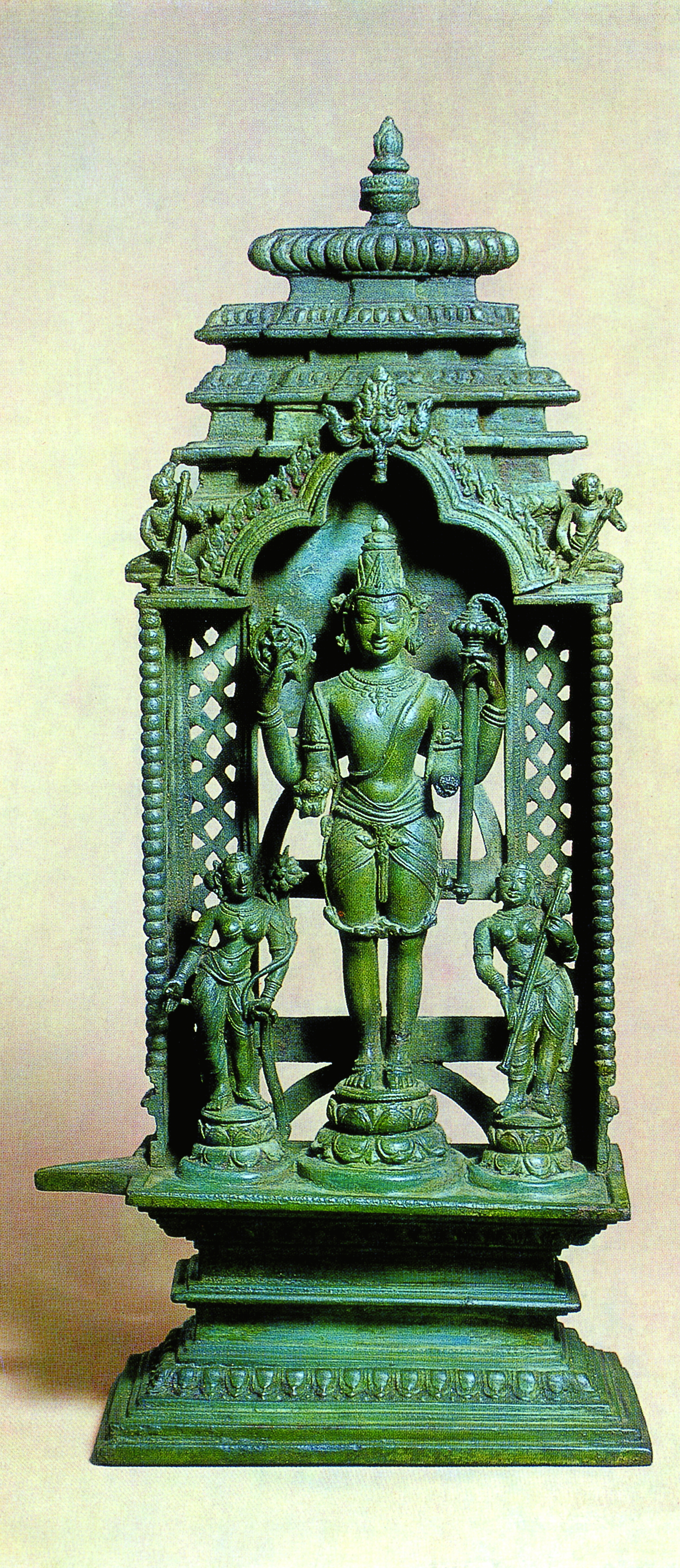 • 由青铜制作的佛龛底部台基和顶部都有莲瓣装饰。佛直立,脚踩典型印度样式的双层莲花台座,一手持法轮,一手持降魔杵,旁边立两曲身立护法,一人持莲花,一人持法杵。