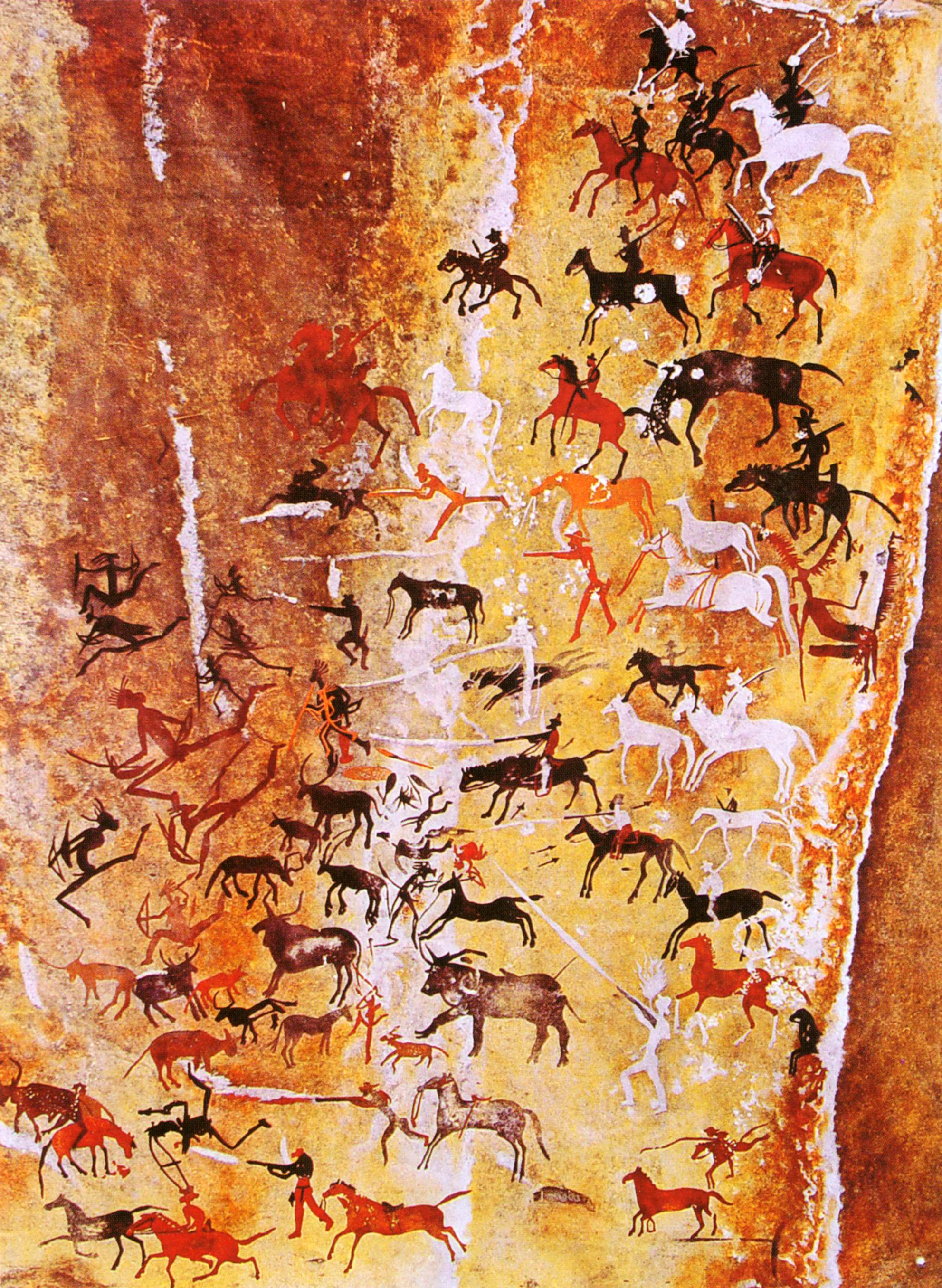 这幅绘画用流畅挺劲的线条进行勾勒和物象造型,线条极为概括洗练,刚健古拙,沉凝有力,造型生动,具有相当的艺术表现力。全幅线条虽然颇为简括,但变化非常丰富,疏密对比、粗细对比恰当、自然。如凤、龙用线对比、人物用线对比,都很有特色。凤鸟之用线,明显比龙纹丰富、变化得多,线条主要突出风的动感造型和优美姿势的表达,在疏密对比上也加以留意,详略得当。如翅膀用线,细密完整,不惜精心刻造,具有装饰性的成分:凤鸟的爪、尾羽轮廓线则粗犷有力,大胆概括,见其尾羽的劲挺和脚爪角质层的瘦硬和坚实。龙之用线,则较为纤细、简略一些,突出其较为安静的静势,与凤鸟的剧烈升腾所形成的飞动之势对比,更显凤鸟的勃勃生机。