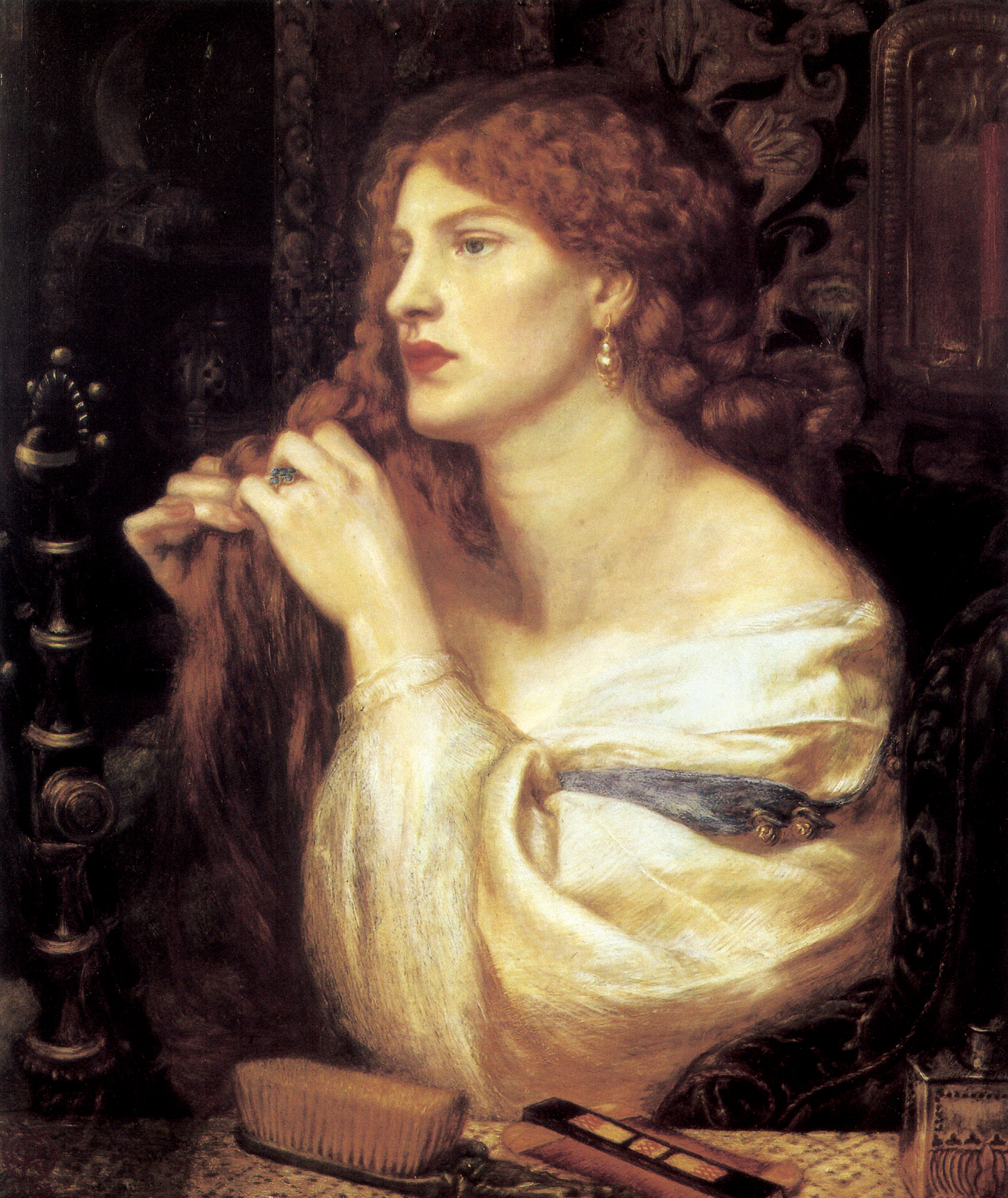 罗塞蒂(Dant Gabriel Rossetti,1828年-1882年)19世纪英国拉斐尔前派重要代表画家。他是拉斐尔前派艺术向后来唯美倾向转变的领导人物,同时也是绘画史上少有的取得独特成就的画家兼诗人。罗塞蒂远离社会问题,不趋向写实画风,执着于象征诗意的表现手法;其深厚的文学修养、高度的诗的热情以及近乎悲剧性的一生,赋予了作品盎然的诗情、朦胧的画意与浓浓的悲剧情绪。