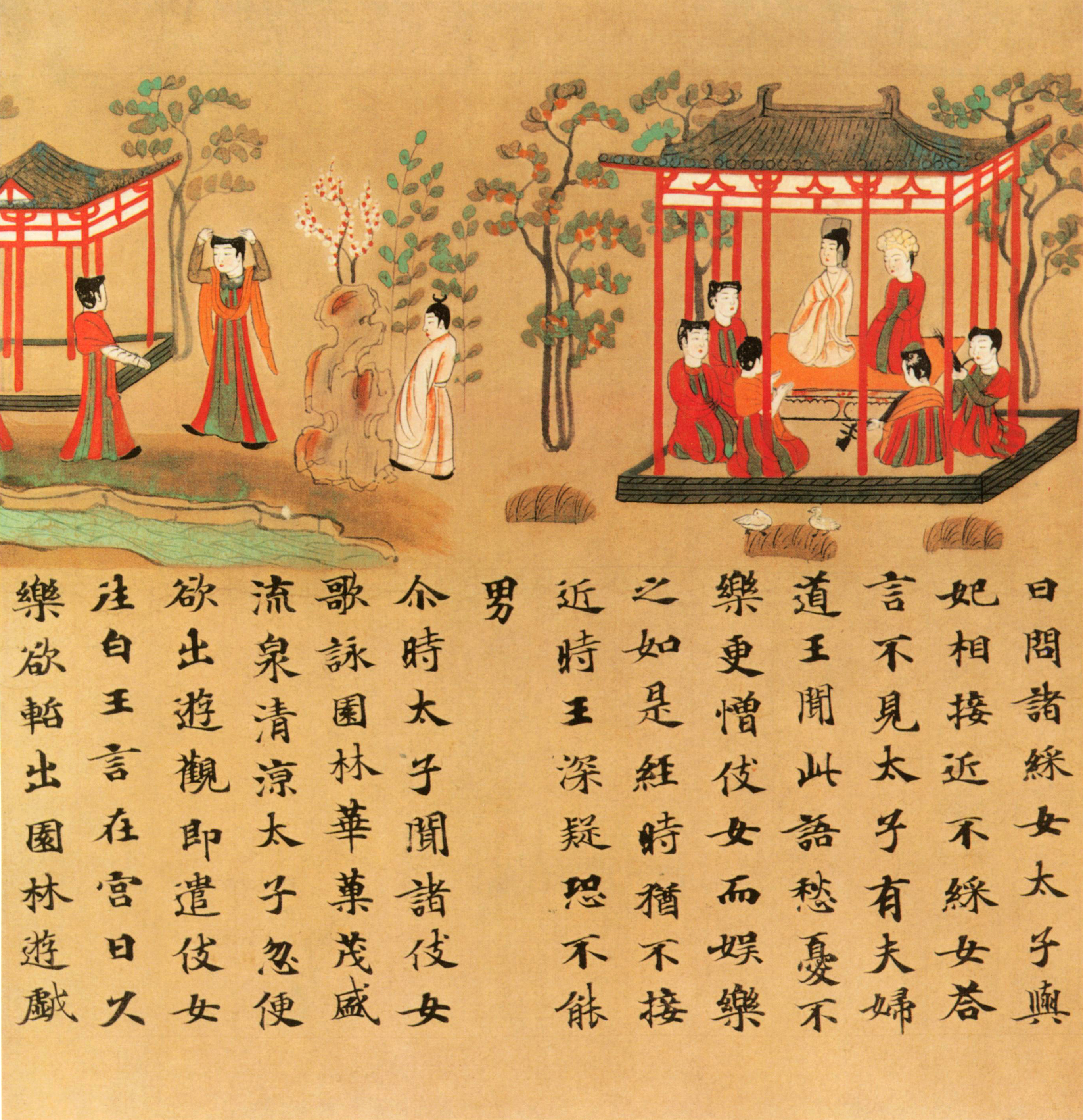 • 宫女演奏音乐,而太子却满怀忧愁,徘徊于苑池边。