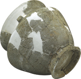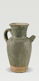扁唇,斜直口,圆肩,直腹,腹部内收,平底微内凹。肩一侧置一短流,另一侧安双条形柄。黄胎,胎质坚致。釉为青色,釉面光亮。内外施釉,釉不及底。