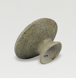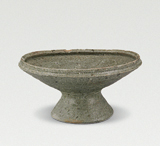 尖唇,直口,斜直壁,大而粗的喇叭形高足,足沿一周斜削,器形不甚规整。胎色浅灰,胎质粗而坚硬。施釉至足,釉色淡青绿色,釉层薄而干涩,有小开片。拉坯而成,应是接足,足腹交接处有一周裂痕。