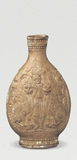 椭圆形口,短束颈,梨形腹,腹部扁平,高圈足。正背面模印相同纹饰,呈浅浮雕状。腹壁正中站立一胡人,左手持物似骨朵,身前两侧蹲坐两只狮子,狮子扭首向前。壶壁两侧模印象首,长鼻垂于底部。联珠纹边框。口部、足壁部分模印联珠纹莲瓣。