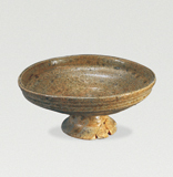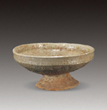 敞口圆唇,折腹,喇叭形圈足。灰胎,青灰釉,釉层不均。内壁中部和底部饰两组细密的凹弦纹,中间刻划篦划纹,口沿外侧饰三道凹弦纹。