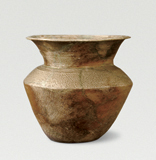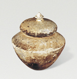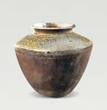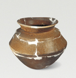 罐小口,折肩,平底。出土时带伞状器盖。釉大部已脱落。底部刻有“+”字符。