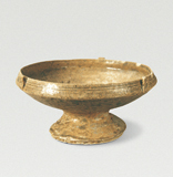 尖唇稍侈,折沿斜腹,喇叭形圈足,整体略有变形。